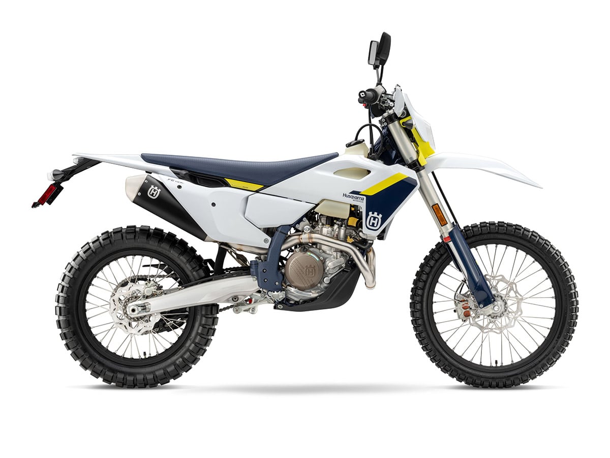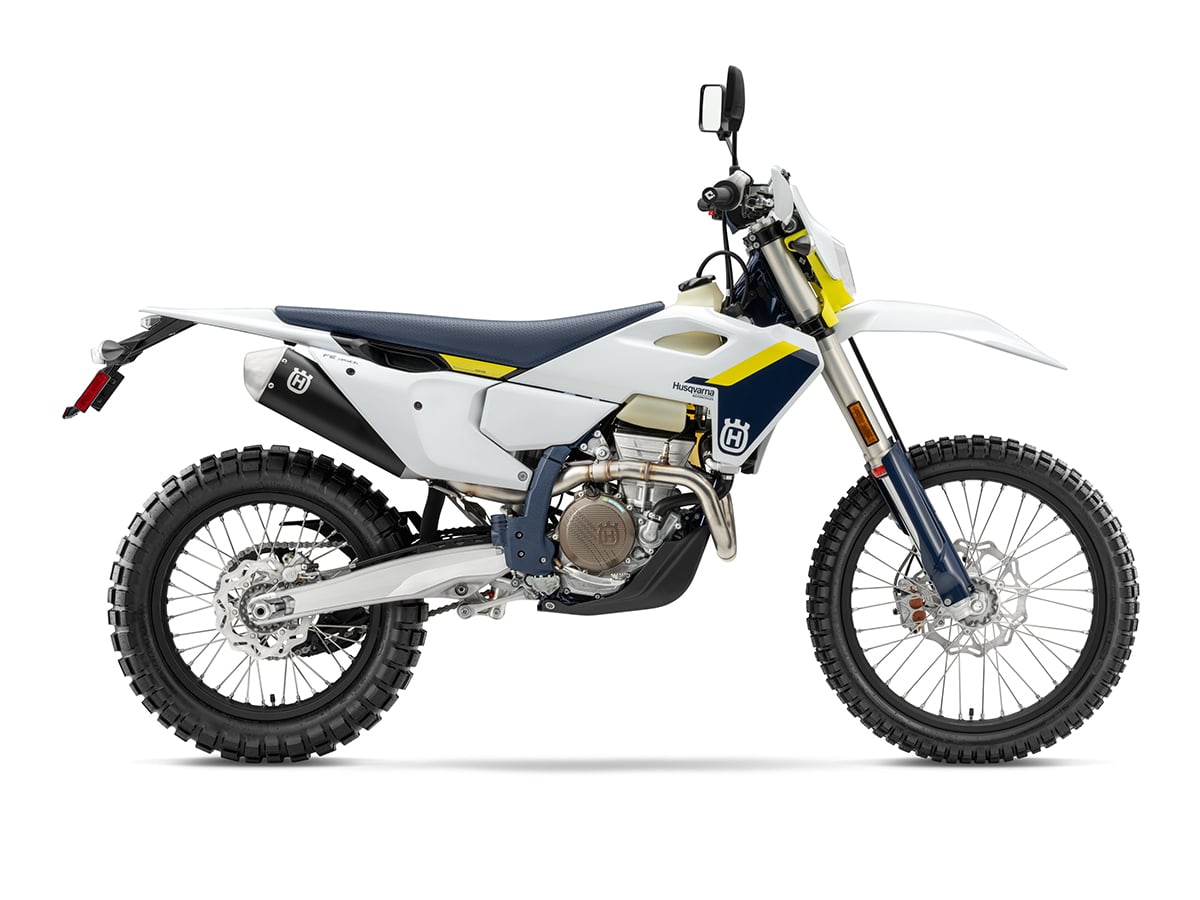Husqvarna’s FE350s is just a little more expensive than the KTM or GasGas dual-sport bikes despite using the same motor. It actually blends some of the components of those two bikes. The Husky has linkage rear suspension like the GasGas and Brembo hydraulics like the KTM. It has bodywork all its own as well, and a proprietary subframe and airbox. The Husqvarna has a map switch that offers access to different power characteristics.