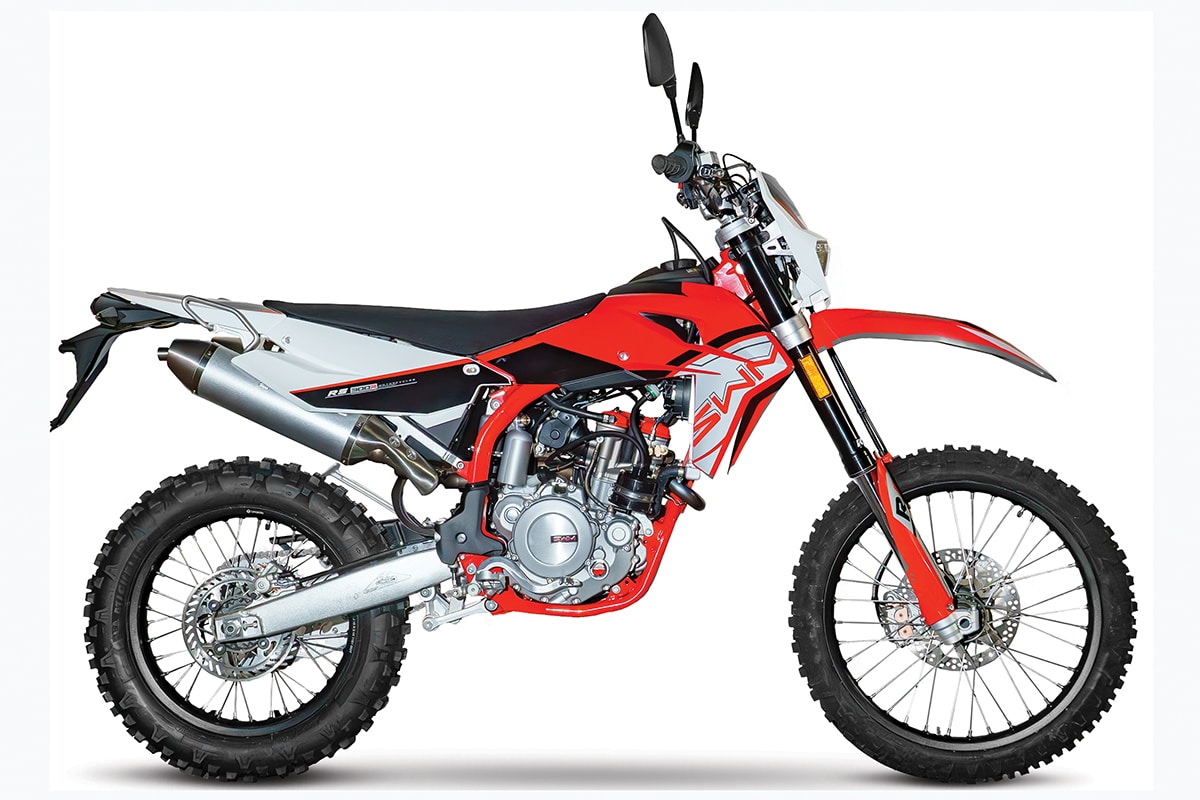 SWM is an Italian company that took over the Husqvarna factory when that company moved to Austria. The RS300R is actually based on the Husqvarna race bikes that came out of the Italian factory prior to 2013. Now, it’s a 50-state-legal dual-sport bike with a very attractive price. It has Mikuni/GET fuel injection, twin mufflers and KYB suspension. We expect an updated version of this bike and perhaps a 500cc version mid-season, although the 2024 model is shown here.