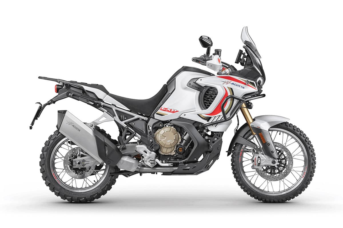 Graphically based around rally star Edi Orioli and his Lucky Explorer machine from the ’90s, the MV Agusta LXP is a limited-edition luxury machine that has strong off-road character and class-leading technology. The engine is a new 950 triple that puts out 124 horsepower. The frame is steel, the swingarm is aluminum, it uses 21-/18-inch wheels and long-travel Sachs suspension (8.3- front/8.3-inch rear). It has a TFT 7-inch full HD dashboard, Bluetooth and Wi-Fi connectivity, cruise control, launch control, and eight levels of traction control. The exhaust is titanium and part of the kit, including Agusta-branded aluminum side cases.
