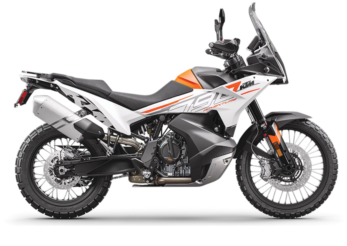 The 2024 KTM 790 Adventure is powered by a 790cc parallel twin, has a reworked clutch and more crankshaft weight for smoother power. The electronics package includes ABS, MTC and ride modes, while the suspension is fit WP Apex dampers front and rear with 200mm of travel. The fork is an open-cartridge unit with split-function technology. Spoked wheels are fit with Pirelli Scorpion STR tires, the brakes are Brembo and rally-inspired bodywork with a wider saddle for improved comfort.