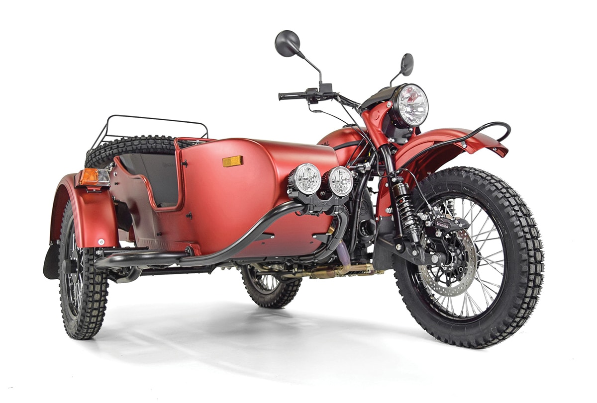 Ural’s Gear Up is a dirt-oriented, 749cc, opposed-twin sidecar motorcycle. It has two-wheel drive, reverse and a spare tire. They now have Keihin fuel injection. The gearbox is a 4-speed with a reverse gear, produces 41 horsepower and is shaft-driven. Front suspension is an IMZ leading-link system, with Sachs handling the rear end. The sidecar is lockable, and the Gear Up has high-end Heidenau tires. It has a two-into-one exhaust, Brembo rear brakes, Heidenau tires, a forged-aluminum swingarm and a center stand. They offer several options, including the Expedition model, which comes with more luggage space, tougher bike and sidecar protection, matching windshields and upgraded suspension mated to a much higher price tag.