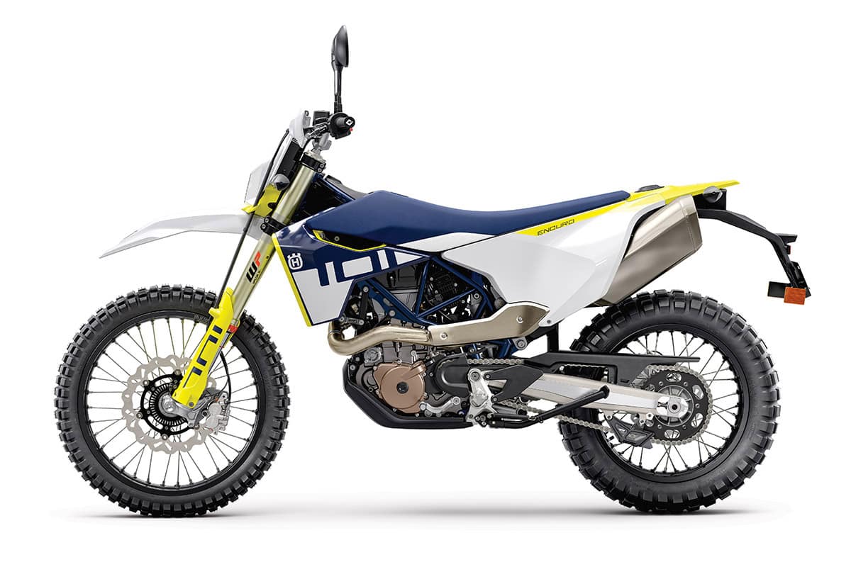 The Husqvarna 701 Enduro is most definitely an overcharged dual-sport machine. It features a 74-horsepower engine, has two power modes, optional front ABS, 50mm Keihin fuel injection, Ride-by-Wire throttle and a 6-speed gearbox that uses an APTC (Adler Power Torque Clutch) that allows for greater speeds in corners, enhanced grip and less braking chatter. It’s wrapped around a trellis frame and a rear subframe that houses a 13-liter (3.4-gallon) plastic fuel tank. The suspension is WP, a 250mm-travel XPLOR fork and identical rear-wheel travel, which exploits its dirt worthiness, and the dry weight of 321 pounds is a boon for the off-road-worthiness of the 701.
