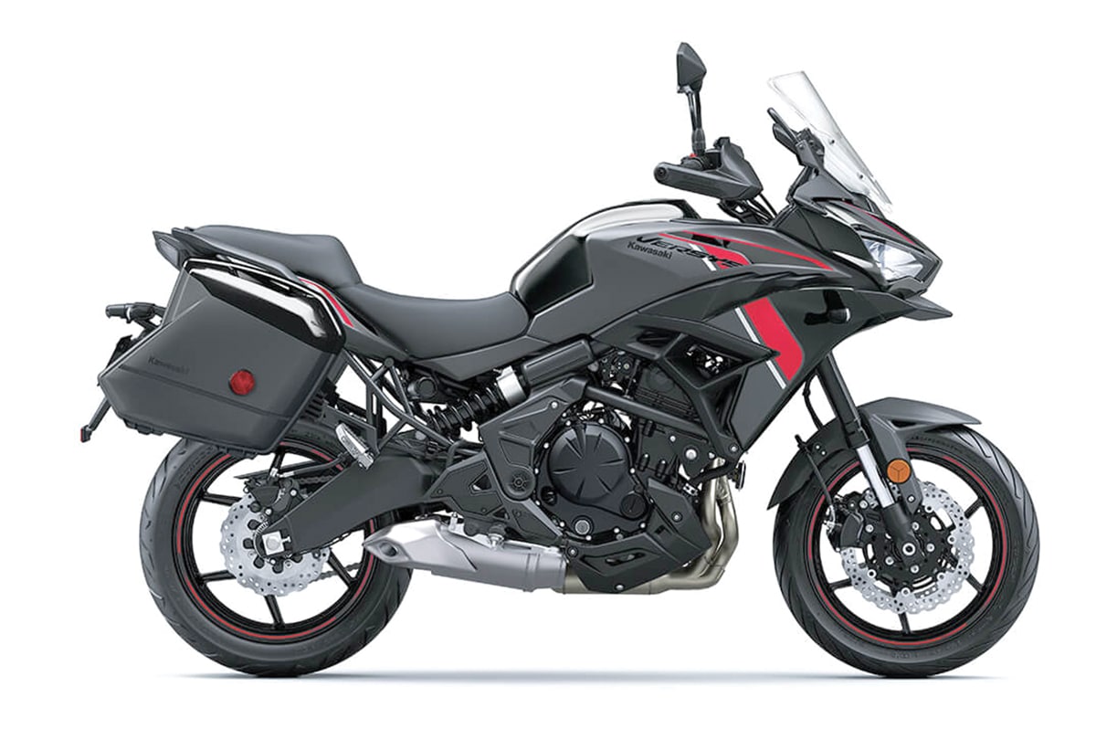 The 649cc, parallel-twin engine has a 6-speed gearbox and sealed chain driveline. Cast-aluminum 17-inch wheels, ABS braking with dual rotors up front and just under 6 inches of travel target the adventure side of touring. The Versys 650 LT comes equipped with a set of hard saddlebags featuring KQR mounts and an integrated mounting system that utilizes the ignition key for simple saddlebag unlocking and removal. The LT version is also fit with handguards. It has an adjustable windscreen, TFT color instrumentation with smartphone connectivity, LED lighting and Kawasaki Traction Control (KTRC).