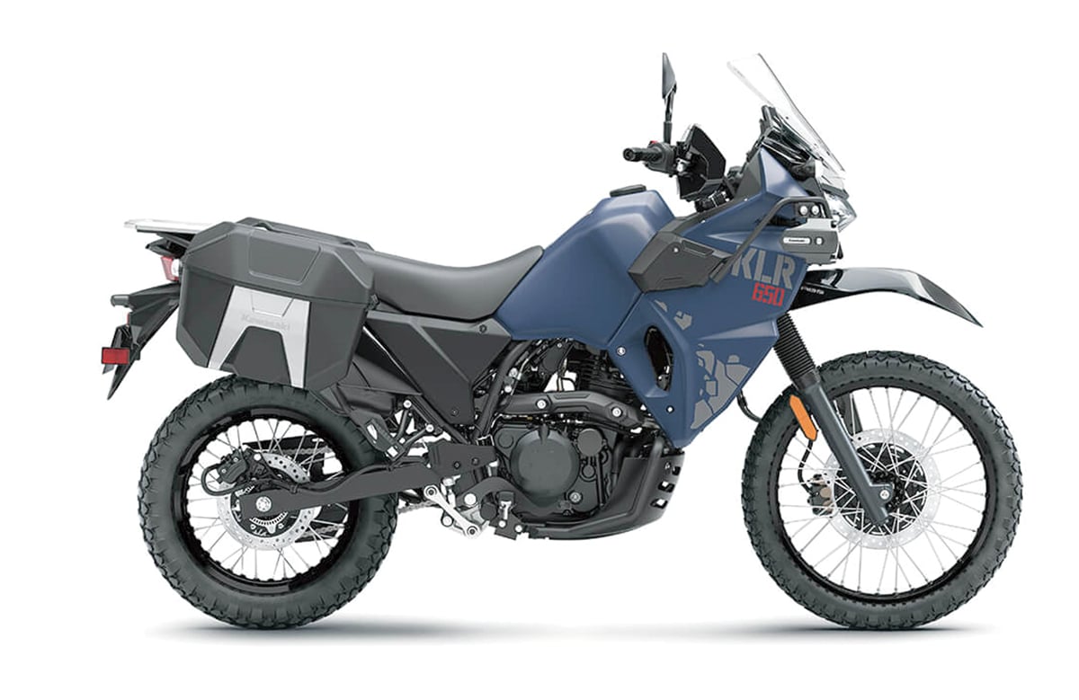 Little has changed with the KLR 650 Adventure. The bodywork has a rally look, the engine is fuel-injected, a 5-speed and is chain-driven. It has an LED headlight; the fork is a conventional, non-adjustable 41mm fork; and a Uni-Trak shock is adjustable for spring preload and rebound damping. Disc brakes utilize ABS. The KLR650 Adventure is their elite of the KLR-based machines equipped with factory-installed side cases, engine guards, tank pad, LED auxiliary light set, DC power outlet and USB socket.