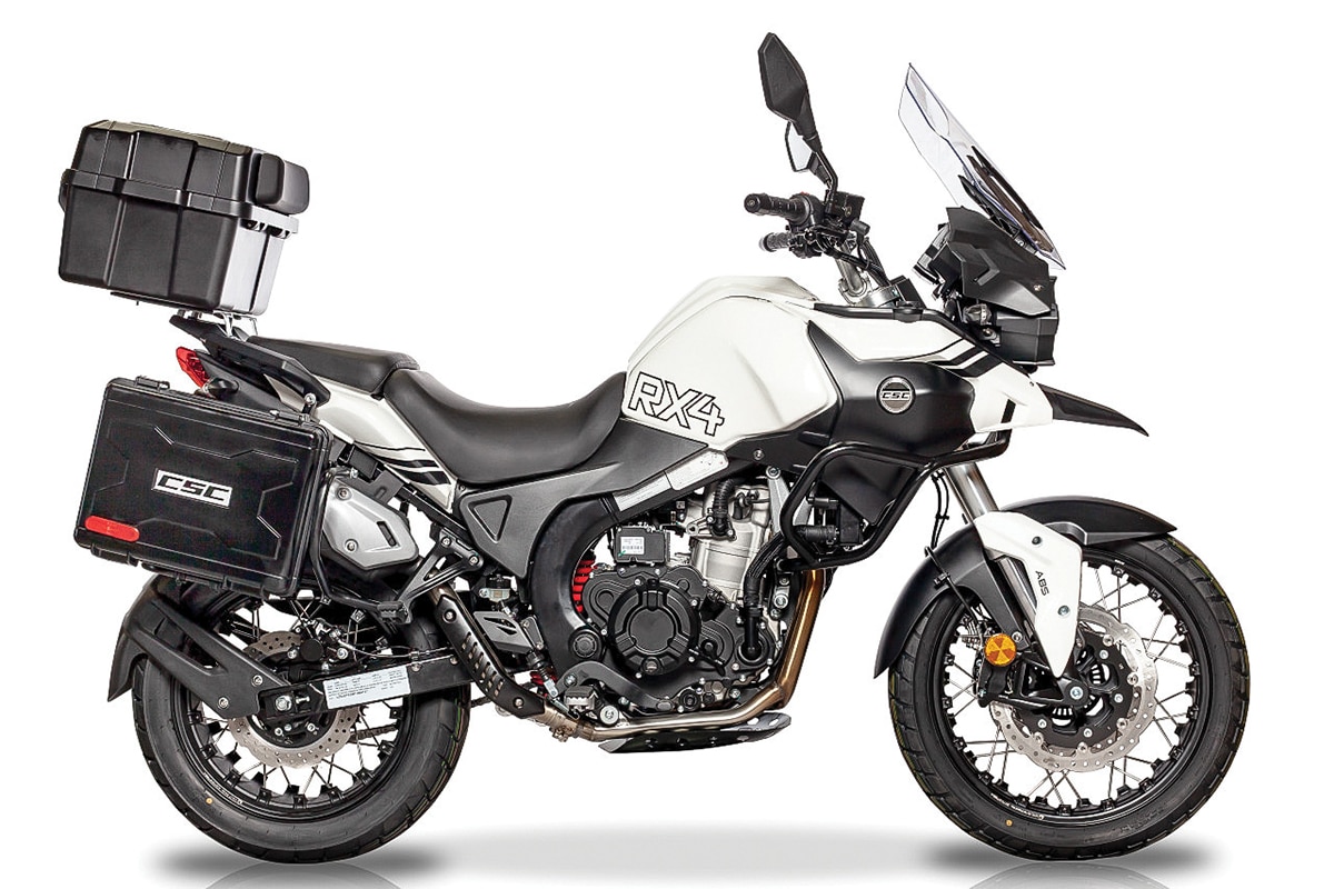 The RX4 has a 450cc fuel-injected DOHC motor with a 6-speed gearbox that makes just over 40 horsepower. The fuel tank holds 5.3 gallons, it comes equipped with an adjustable windscreen, a 7-inch TFT display, ABS, LED lighting, dual disc brakes, plus the RX4 comes with molded side cases and a tall rear box. Competitively priced, the company sells its products online and offers a one-year warranty.