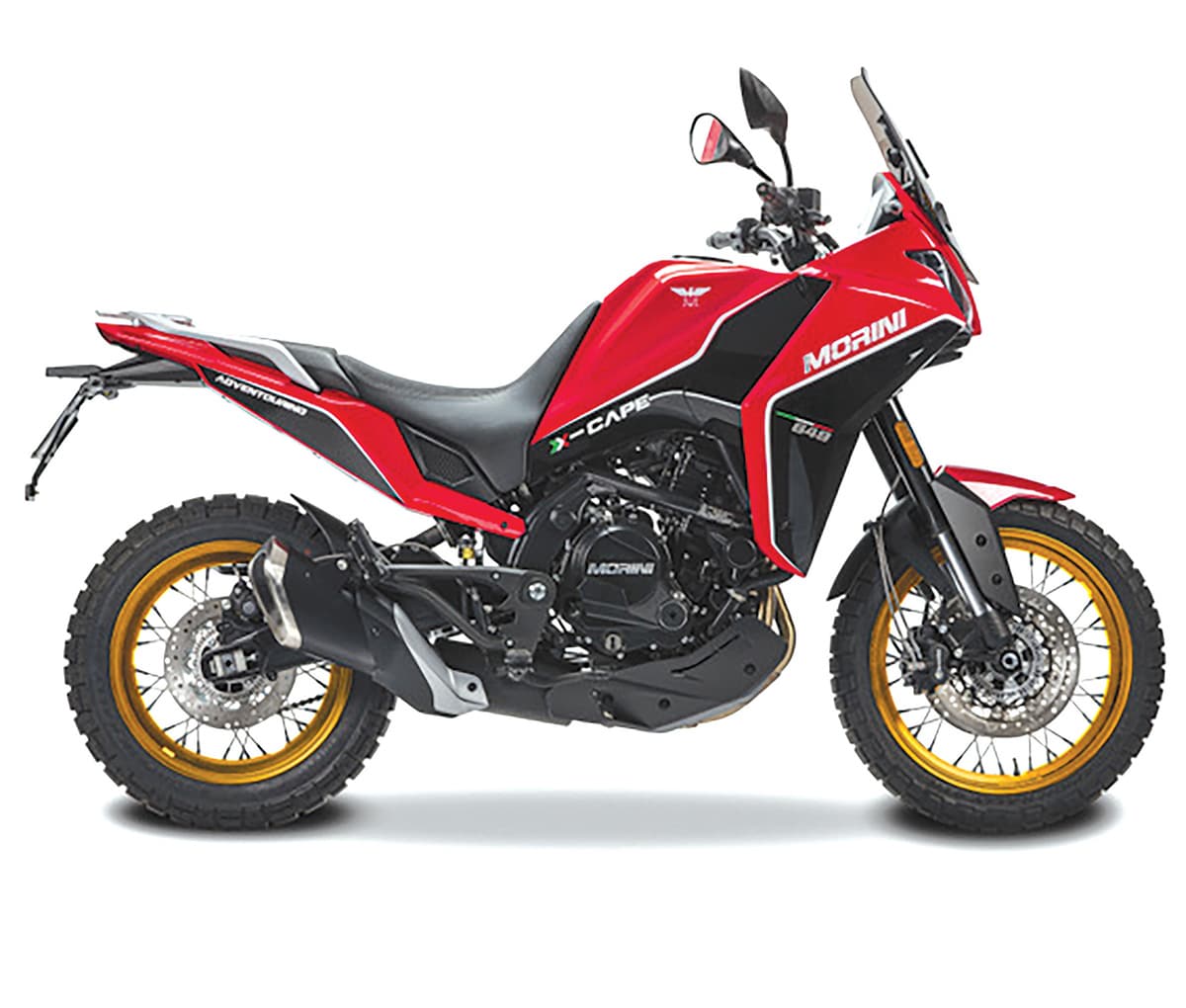 The Moto Morini X-Cape is powered by a DOHC, 649cc parallel twin that puts out 60 horsepower. It has full LED lighting and a 7-inch TFT color dash, with Bluetooth calls, music and maps. The fork is a 50mm inverted Marzocchi damper, and out back the X-Cape uses a KYB damper. Braking is handled by Brembo. It uses spoked wheels that are wrapped with Pirelli Scorpion STR Rally tires, and it comes equipped with an adjustable windscreen.