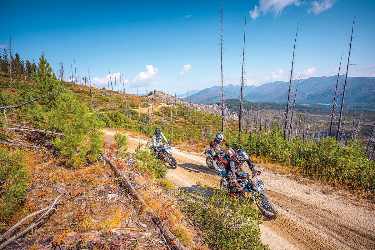 In my case, I had never ridden in that area of Idaho before, so I spent more time rubbernecking and taking in the scenery than concentrating on the trail. The 390 isn’t renowned for its trail capabilities, so I decided to take the B route on day one. It had rained the night before, so there was no dust, and most of the riding was all about taking you to amazing places and beautiful overlooks. On day two, I was ready to ride, so Ryan and I took the A route. Aside from the occasional log, it was well within the 390’s comfort zone. For the record, I never cowboyed up and jumped the log like Birch. Ryan and I found a safe way around. I am who I am, and the 390 is what it is. In the end, it didn’t matter what I was riding. It was still a fantastic experience that I hope to make an annual habit.