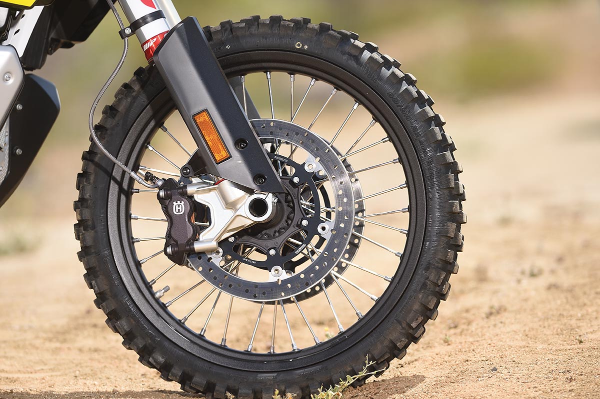Even though there’s no Norden Rally, Husqvarna does allow you to buy all the parts to make your own. The WP Xplor Pro fork uses Cone Valve technology and is much beefier with 270mm of travel. That compares to 220mm on the stock Apex fork and 240 on the KTM 890 Adventure R. The Xplor Pro shock is also a considerable upgrade, with fully adjustable high- and low-speed damping, as well as turn-screw preload adjustment. That gives the Norden 270mm travel in the rear as well. After the suspension upgrade, the seat height is upped to 35 inches—2 inches more than stock. That means you have to extend the kickstand or the bike will fall over. If you don’t want to cut and weld, there are aftermarket kickstands available. The price for the WP Xplor Pro suspension is steep—$3600 for the fork and $2200 for the shock. That alone pushes the Norden over the price of the KTM Rally, but it’s worth pointing out that you still own your original shock and fork, which retain some value. And, there’s no waiting list.