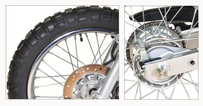 It’s easy to see where Honda shaved production costs. The little XR uses technology from 30 years ago. It has an air-cooled, two-valve motor with a real-live carburetor. Don’t ask us how that slipped by. The rear wheel has a drum brake, and the suspension is non-adjustable. It does have electric start, a six-speed gearbox and a hydraulic front disc brake. If you want to jump in a time machine, you can go back to 1995 and pay $3149 for a Suzuki DR125ES with most of the same features.