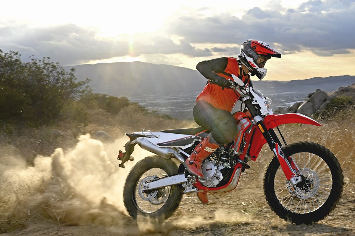 In outright power, the RS300 is nothing special. It might be a little faster than the Japanese 300s, but that’s a very low bar. It takes a big handful of throttle to get the motor’s attention, and even then it struggles with steep hills and sinks in deep sand. The powerband reminds us of old-timey thumpers; it’s very linear and takes its time to build up revs. The bike will actually keep on revving and revving, and in that way, it has a broad operating range. That gives it a certain efficiency when it comes to finding traction. When you need to maintain your speed on marbles and rolling rocks, the SWM’s linear personality is ideal. Back in the day, all four-strokes were like this, and we loved them for it.