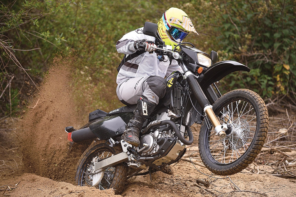 With decent tires, the Suzuki has no trouble keeping up with more modern dual-sport bikes on moderately difficult singletrack. The Suzuki’s handling and suspension are surprisingly good, and the ergos are almost modern feeling—definitely more up to date than a Honda XR650L or a Suzuki DR650. It feels so normal, in fact, that you could easily get carried away. In the end, the weight will make its presence known on a steep downhill or in a tight turn, and you won’t make that mistake again.