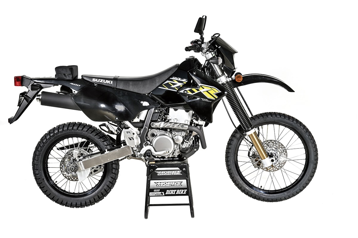 Yes, the DR-Z was designed in a different era, but if it were built today, it wouldn’t be that different. The carburetor would have to go, of course. But, the motor is a compact, double-overhead-cam four-valver with electric start and a counterbalancer. About the only difference between the layout of this motor and that of most modern four-stroke motocross bikes is that it doesn’t use finger-followers in the drivetrain. The DR-Z uses a shim and buckets to drive the valves directly. There are a few other old-school design elements. It still has what we used to call a “right-side up” fork. It has a steel tank, a steel frame and a steel handlebar. Think back to when this bike arrived. At the time, there was no Honda CRF450R, and no serious motocross four-strokes from Suzuki or Kawasaki, so the DR-Z acted as the Suzuki off-road race team’s primary weapon out west. Mike Kiedrowski won back-to-back WORCS championships in 2001 and 2002 on a Yoshimura-built DR-Z against a field of Yamaha 426s.