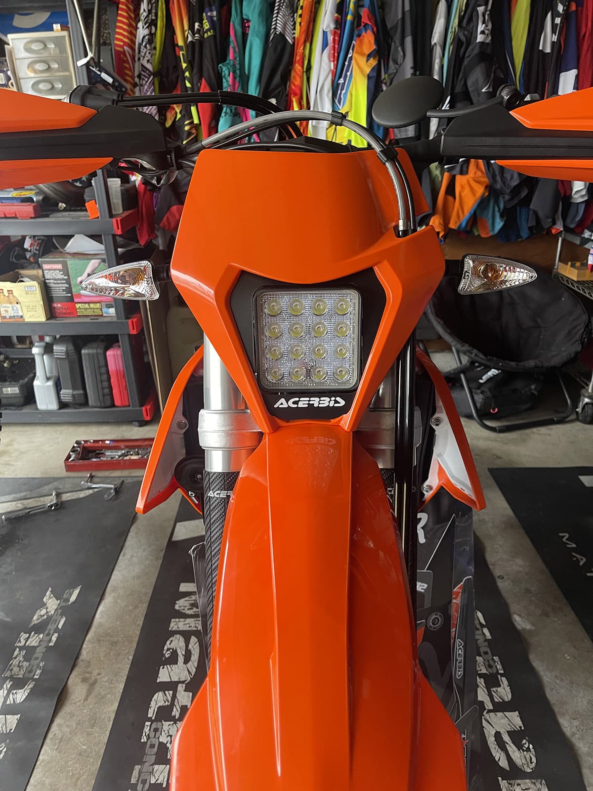 14. Acerbis VSL front head light. This is a plug-n-play headlight from Acerbis. It kicks up your lighting to 4320 lumens! This light is so much brighter than stock. The light also has some protection around it. It was nice not to have to do any extra wiring, drilling, or take off two days of work to get this on. It was about a 10 minute install.