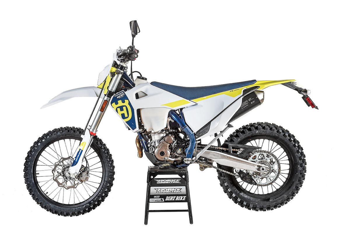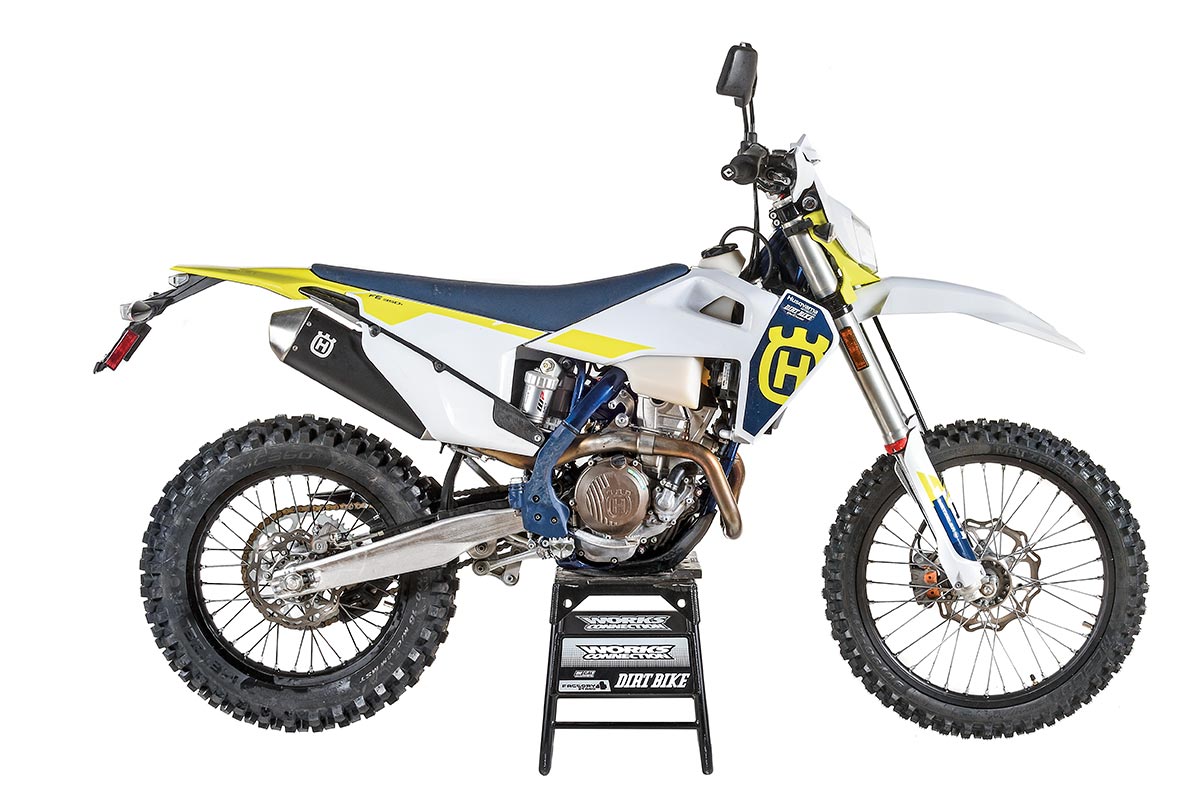 The motor is identical to the one in the KTM 350EXC-F, but the Husky’s frame, rear suspension and a number of components are different. The rear suspension uses linkage. The triple clamp is machined rather than cast, and the brakes are made by Braktec, as is the hydraulic clutch. The handlebar is ProTaper. The rims are D.I.D and the bodywork is distinctly Husqvarna. When this bike was being developed, it was clear that the engineers put serious effort into making it quiet. One of the methods they employed was the placement of a reed valve between the filter and the throttle body. Noise was also one of the main reasons for the use of Continental TKC80 tires. These are very street-oriented and make very little noise in the ride-by sound test. As a side note, earlier models had a recall of the Continental tires, but that did not affect this particular bike. As mentioned earlier, we replaced the tires with Metzeler TC360s, which were a considerable improvement in the dirt. As delivered, the Husky does not have rim locks installed, but they come with the bike in a small tool package. With real knobbies, you definitely need rim locks. It’s also a good idea to balance the tries.