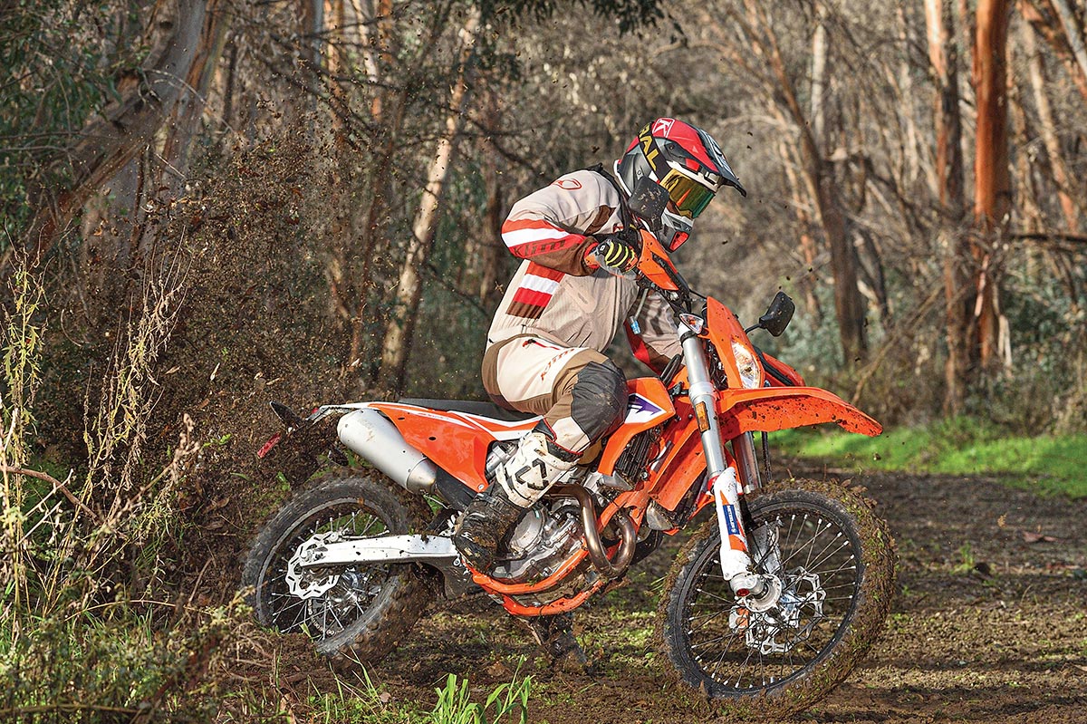 The KTM has a feel that’s typical of PDS bikes. It’s fairly level at lower speeds and might even be the best at absorbing rocks and trail junk. But, as the trail pace picks up, it develops a bit of a stink-bug attitude. The rear end unloads and the front end dives. It already has much quicker steering than the Beta, and that gets more pronounced at higher speeds.