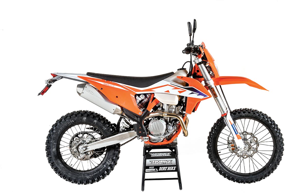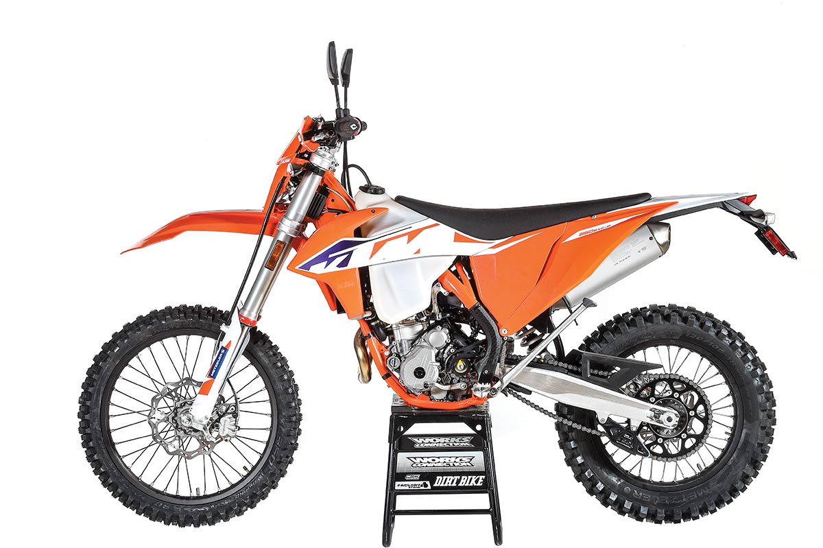 KTM wasn’t the first company to make a serious dirt-worthy dual-sport bike, but you can give the Austrian company credit for making the concept truly legit. The KTM 350EXC-F goes back to 2012 and was most recently revamped in 2020. KTM’s off-road and dual-sport models continue to use PDS rear suspension sans linkage. This is the most significant difference between the current KTM and Husqvarna dual-sports. PDS has the advantage of being about 6 pounds lighter and providing greater ground clearance than linkage designs. Otherwise, the two Austrian dual-sport bikes are similar. They both use WP Xact forks with steel coil springs. The KTM uses a cast triple clamp to hold the fork on, and if you look closely, there are a number of other components that differ as well. The KTM has Brembo brakes and a Brembo clutch master cylinder. It also uses a Neken handlebar and Excel rims. As far as the motors go, the KTM and Husky have 6-speed gearboxes and double overhead cams with four valves and finger-follower valve trains, just like the motocross bikes. The KTM uses a reed valve in the air boot, although that boot has a different shape than the Husky’s because the PDS shock allows more space. That and a different airbox design are the only features that might account for any difference in performance between them. The KTM also comes with handguards, a skid plate and a radiator fan. The tires are Continentals, which we replaced with more aggressive Metzeler MC360s. The KTM sells for $12,149 and weighs 239 pounds without fuel.