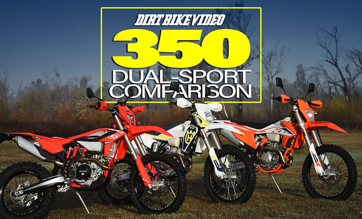Today’s 350 dual-sport bikes have evolved into serious dirt bikes that just happen to be street legal. The Beta 350RR-R, Husqvarna FE350S and KTM 350EXC are lightweight off-road bikes with full DOT, EPA and CARB approval. The timing was perfect for our 2023 350 dual-sport comparison. The dirt was wet here in Southern California and we had brand-new versions of all three 350s. We rode them all stock with the exception of tires. We upgraded to Metzeler MC360 tires which are classified as mid-hard terrain but still DOT approved and street legal. Join us as we explore the mountains of Southern California and learn about the 2023 crop of 350 dual-sports.