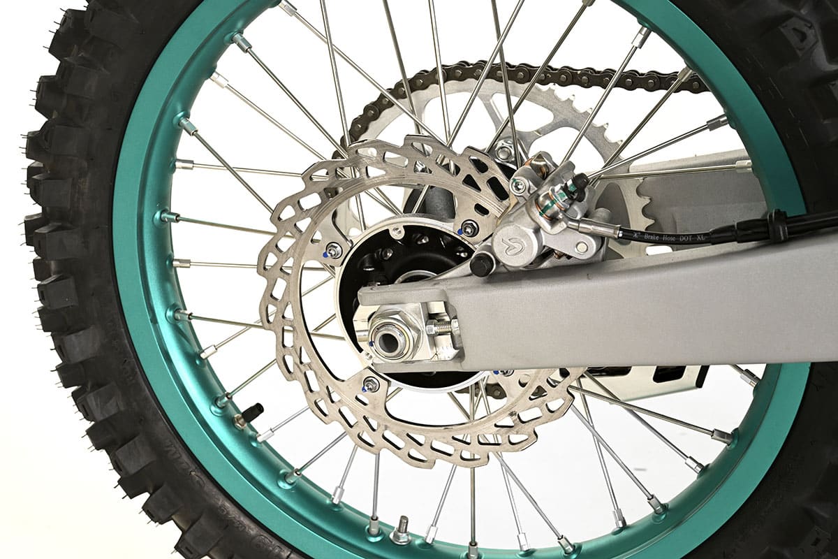 The frame is unlike anything from Japan. It’s made of steel and has a central backbone, like a KTM, but the geometry and construction are quite different. There is, however, a strong resemblance between the Kove’s Chinese-made suspension components and the Showa units that come on the Honda CRF250R. The closed-cartridge fork is made by a company called Yu An and looks so Showa-like, it makes us wonder if Yu An might be a vendor for Showa. We know that many mainstream Japanese companies source parts in China, but it’s hard to track down the specifics. Service technicians say that a Yu An valve stack is virtually interchangeable with a Showa’s and that the actual valving is just like that of a 2022 Honda. The Yu An shock also looks like a Honda’s but with the clickers on the opposite side. That theme continues with the brakes, which are made by a Chinese company called Taisko. They are dead ringers for Nissin brakes.