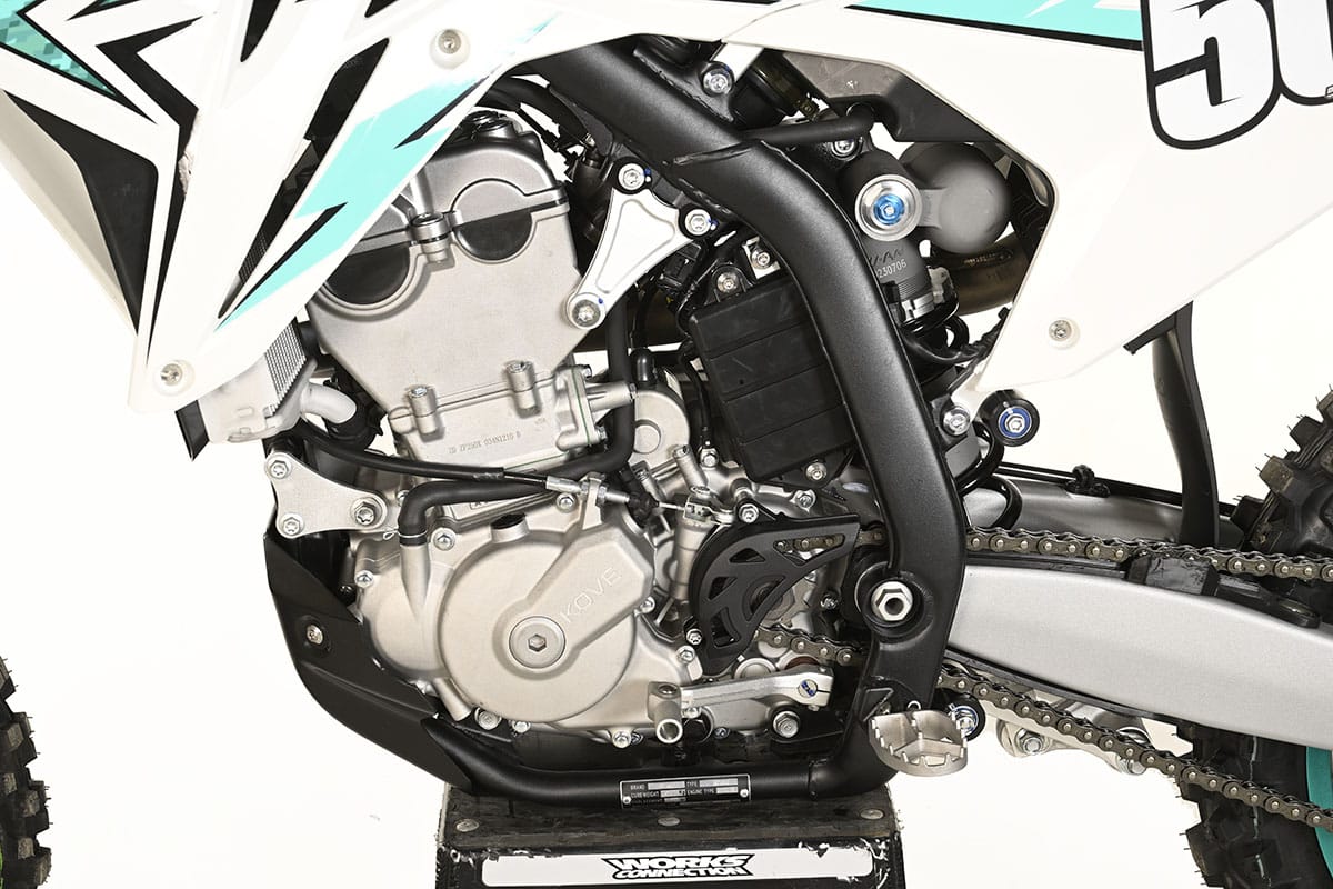 Kove has only been around as a motorcycle brand since 2017, although its manufacturing centers have been in existence far longer. The MX 250 motor is a joint venture between Kove and a Chinese firm called Zongshen. Kove’s engineers redesigned the top end, the clutch and several other components. It’s a 249cc single with a double-overhead-cam electric-start; a 6-speed gearbox; and Bosh fuel injection. There is only one clue that the motor has been used elsewhere; there’s a plugged-up hole that once housed a kickstart shaft. Virtually everything is sourced in China, which allows the MSRP to come in at $5999. To put that in perspective, other 250 four-stroke motocross bikes range from the $8099 Suzuki RM-Z250 to the $10,299 Husqvarna FC250.