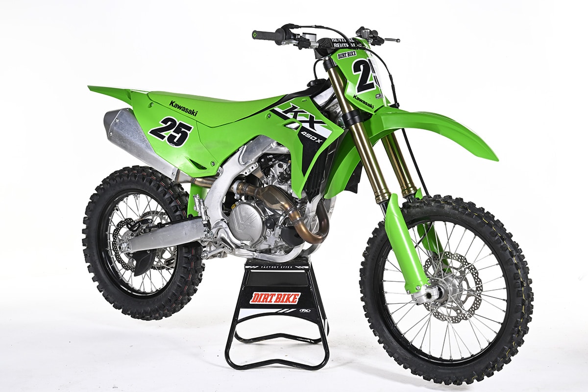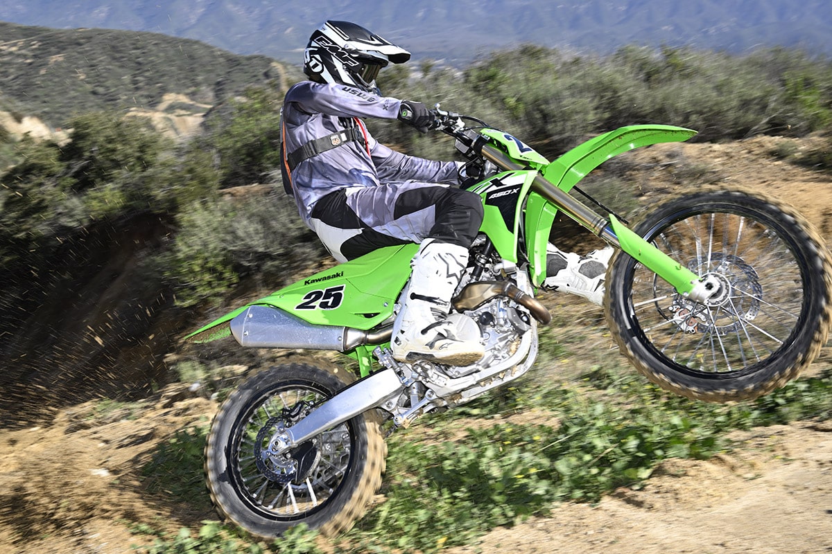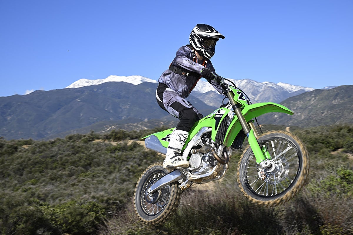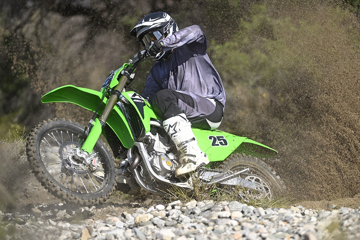 In previous years the KX450X was predictable and had planted overall handling characteristics that made it a favorite. The 2024 model is quicker-handling and lacks a little bit of stability in stock trim at higher speeds, and under hard braking it can get a little twitchy up front. To combat this during testing, we stiffened up the fork and added a couple of clicks of rebound to keep it higher in the stroke and prevent it from diving, ultimately giving us that twitchy feeling.