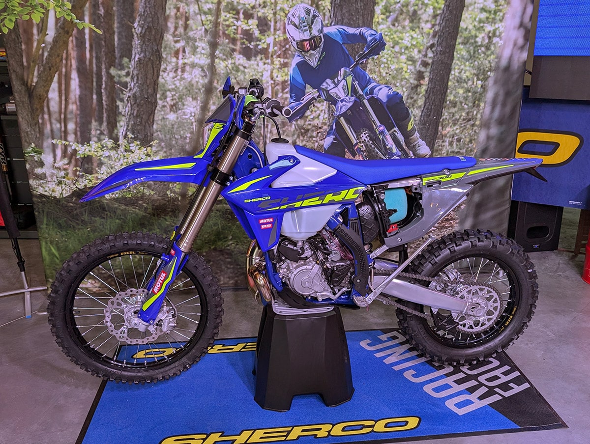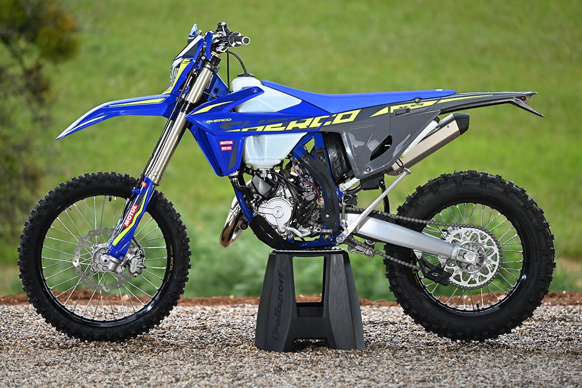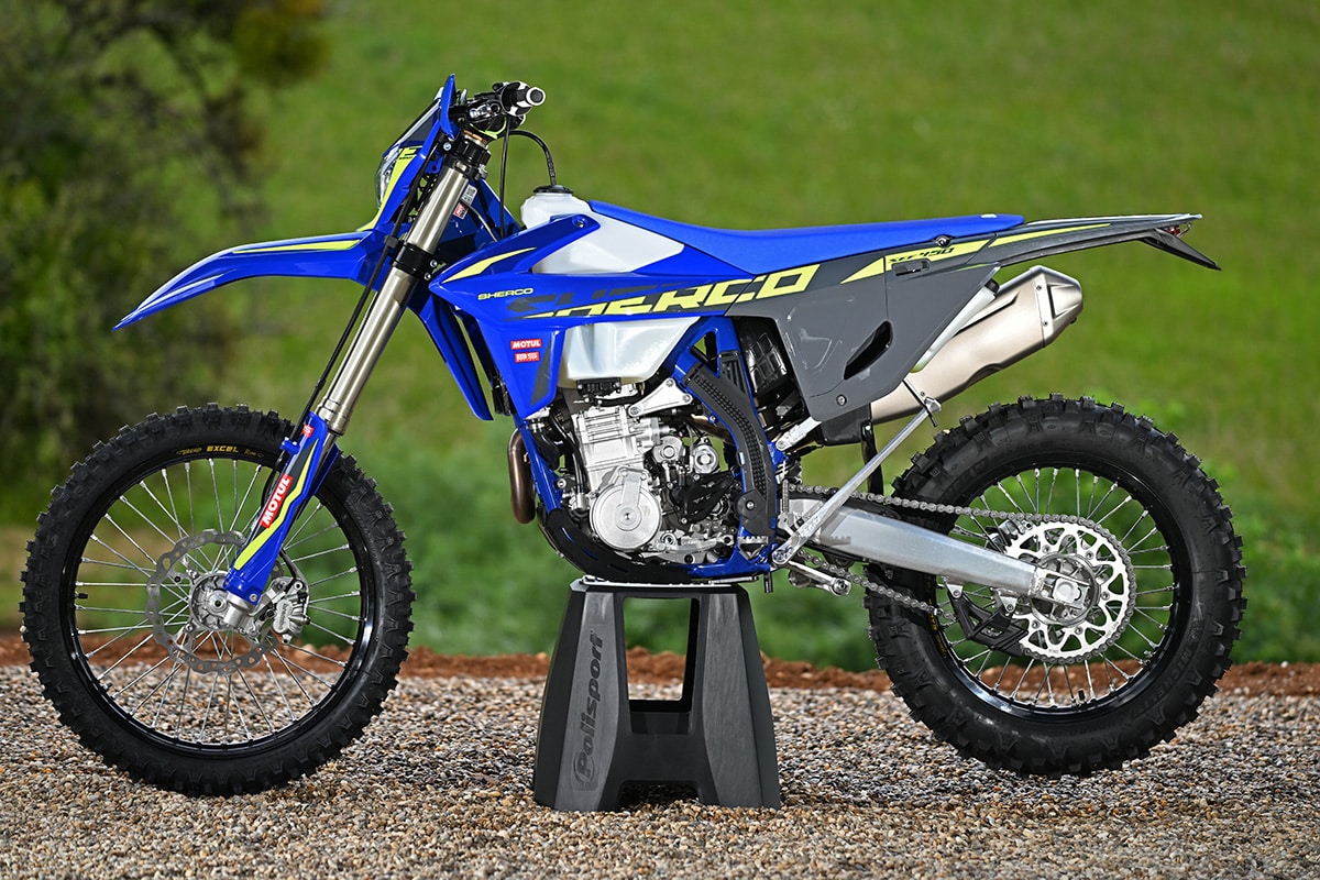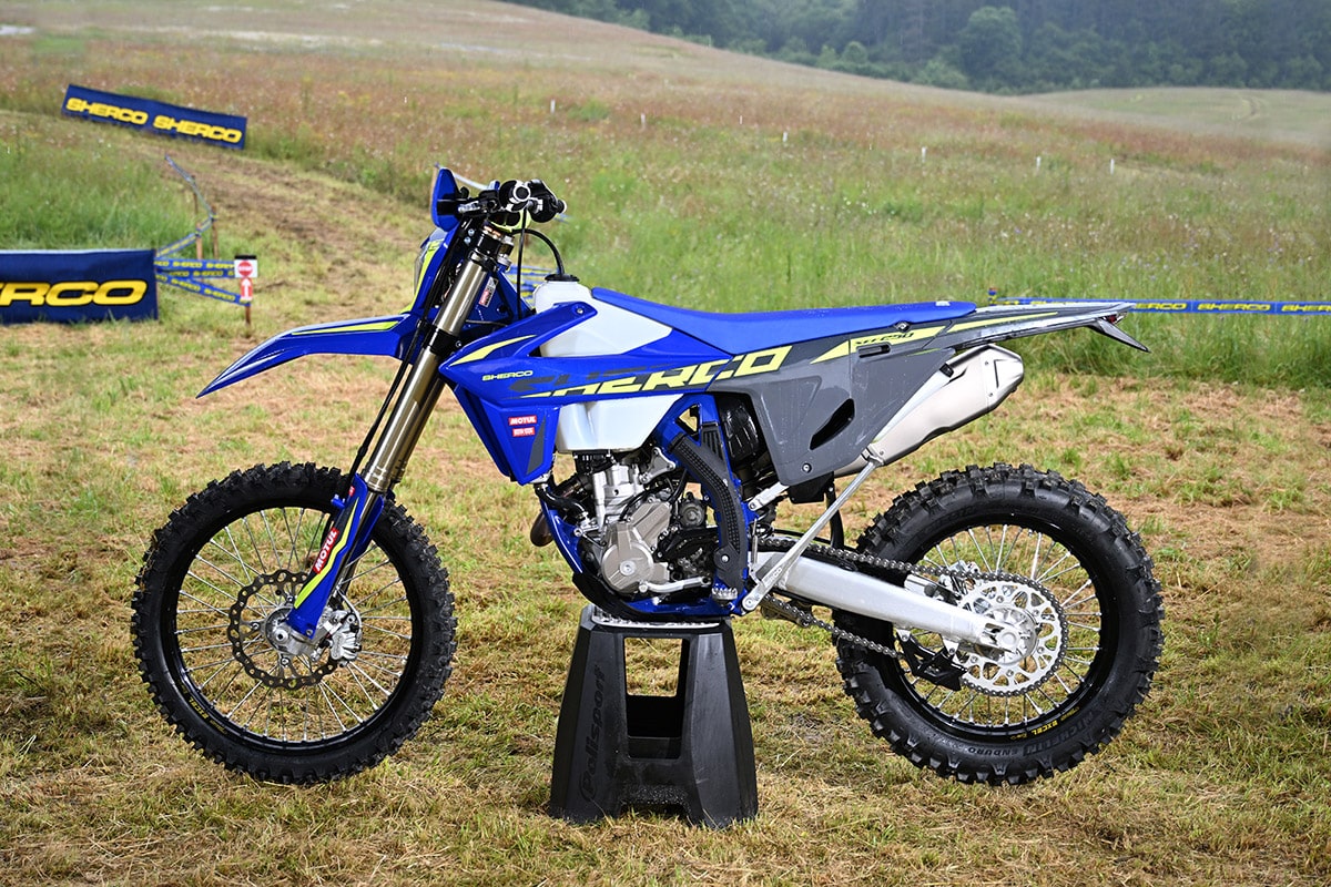 It’s easy to get lost in Sherco’s alphabet soup nomenclature, but the models without the “F” suffix are the two-strokes, and those are the ones that the company is most famous for. The 250SE and 300SE are among the world’s most successful hard enduro bikes. They both have electronic power valves and Keihin carburetors. It’s interesting to note that Sherco built a limited run of throttle-body fuel-injection two-strokes over 10 years ago. The project was put on hold indefinitely. At the time, Sherco said that EFI technology hadn’t yet reached the point where it demonstrated a clear advantage. Apparently, the company engineers still feel that way.