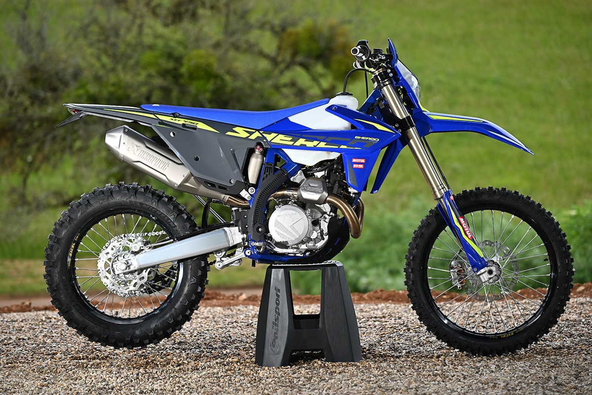 When we think of Sherco, we generally think of two-strokes, but the company’s big four-strokes have an impressive racing resume of their own. The 450/500 platform won the 2020 National Enduro Championship with Grant Baylor and has clicked off stage wins in international rally racing. For 2025, all the Sherco off-road bikes get a new frame and redesigned bodywork. Weight loss was a big focus, whereas the basic chassis geometry didn’t stray too far from the existing design. Grams and milligrams were shaved off of the subframe, the cooling system, the axles, the engine mounts and even the wiring harness. The 450 and 500 also got the new wheels that the smaller bikes got previously. The fuel-pump, mapping and the Akrapovic exhaust are all updated, too.