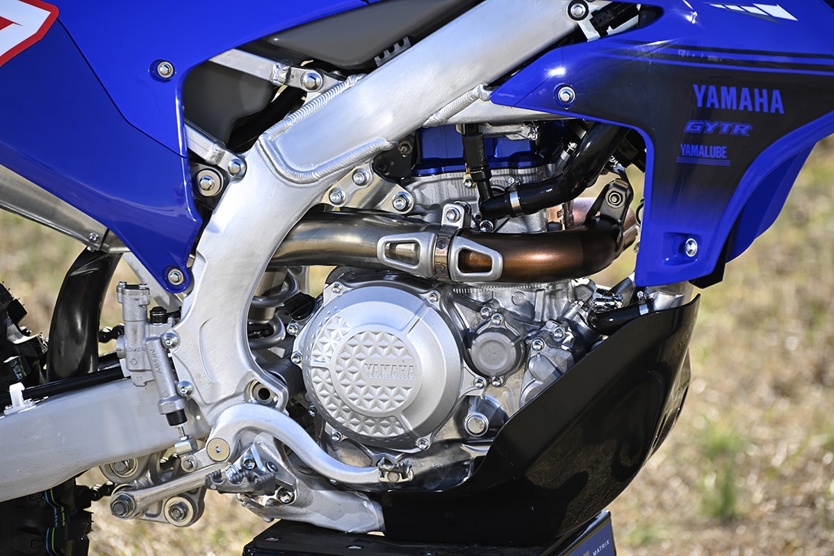 Another gift that Yamaha gives off-road guys is a 10mm decrease in seat height. The motocross version got taller in 2023,which wouldn’t have played well with the FX crowd. Another significant difference is the FX’s power delivery. The motocross version is a beast. In its standard configuration, it’s the hardest-hitting MX bike on the market. It does have a handlebar-mounted map switch, but both maps are the same until you modify them with the Yamaha Power Tuner smartphone app. For the FX, Yamaha gives you two different maps, no fiddling required. The standard map is already a little smoother than that of the MX bike; the secondary map is smoother yet. From there, if you want to make further tweaks and mods, you can dive into the Power Tuner. You can also activate three levels of traction control with the Power Tuner. The final items were a plastic skid plate and a slightly different muffler spec—although there is no spark arrestor and no discernible reduction in noise, the rider still hears more from the airbox than the exhaust.