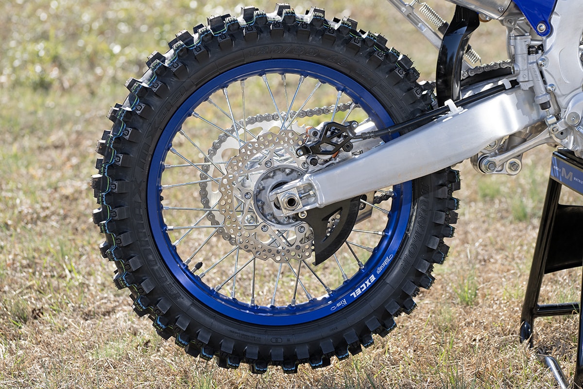Last year’s YZ450F was a very big deal in the motocross world because the whole bike was redesigned. It lost weight, gained power and every single piece got a new part number. For the FX, that was the starting point. First, it got all the boilerplate off-road mods—kickstand, 18-inch rear wheel, softer suspension settings and an O-ring chain. From there, the gas tank was enlarged from 1.6 gallons to 2.1. Because of the YZ’s high-boy airbox location, there’s actually room under the seat for the additional capacity, so the rider doesn’t notice that the tank is any bulkier. Next, Yamaha addressed the gearbox. All the other manufacturers use the motocross gearbox for their cross-country racers, which is fine for racing, but not as good for general-purpose riding. When you work out gear-by-gear comparisons between the FX and the motocross bike, the overall ratio for first gear is around 17 percent lower. Second is 11 percent lower, and third is 3 percent lower. Fourth is 4 percent taller, and fifth jumps up to 14 percent taller. That means at 10,000 rpm, the YZ450F will top out at 84 mph, while the FX will hit 96.
