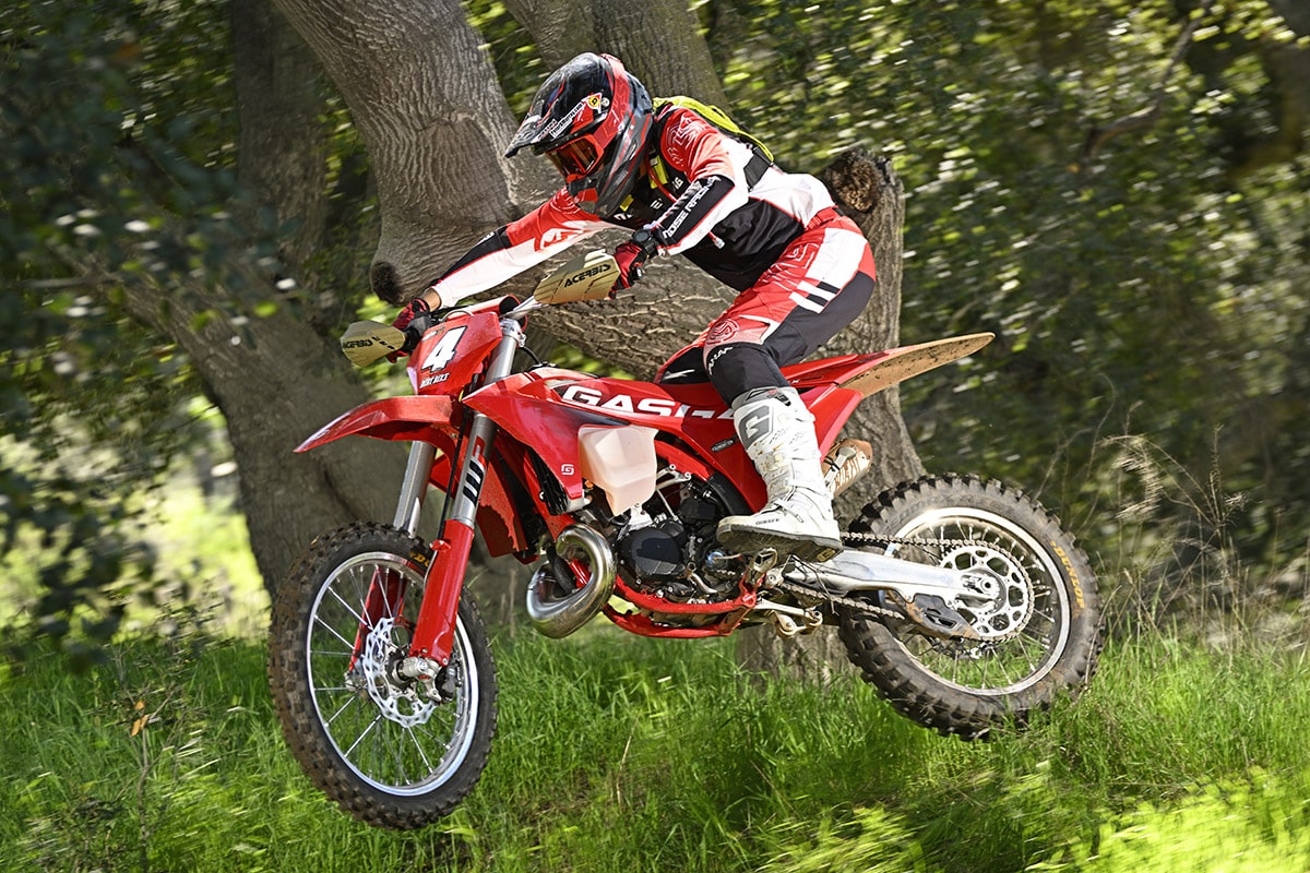 Along with the new motor comes a new frame that’s more rigid in most planes of movement. This year, the GasGas also gets the new coil-spring WP fork. It’s called an “Xact” fork, which is what WP calls the air fork on the motocross bikes, but it’s quite different internally, beyond the move to springs.The philosophy behind the GasGas brand is to offer features similar to KTM but at a lower price. It’s still not cheap; the EX300 sells for $10,599–but that is $700 less than the KTM 300XC. You have to give up a few features along the way; the GasGas has no map switch, no handguards and no skid plate. There are a number of components that are different, most notably the Braktec brakes and hydraulic clutch. Compared to last year’s bike, you also give up oil injection, although that feature still comes on the EC300–which is more trail-oriented.With or without the map switch, the greatest thing about this motor is how well it works at super low rpm. You can lug it down to idle and it’s just unstoppable. The motor always runs extremely clean, too. With last year’s transfer port injection, it seemed like it always had a lean surge down low. That’s pretty much gone. Now the bike always seems like it has perfect jetting. There’s lots more to test here, especially when it comes to changes in altitude and temperature. We’re going to take the bike up to Caliente, Nevada for Scot Harden’s Nevada 200 trail ride in a few weeks. It should be the perfect bike for that.