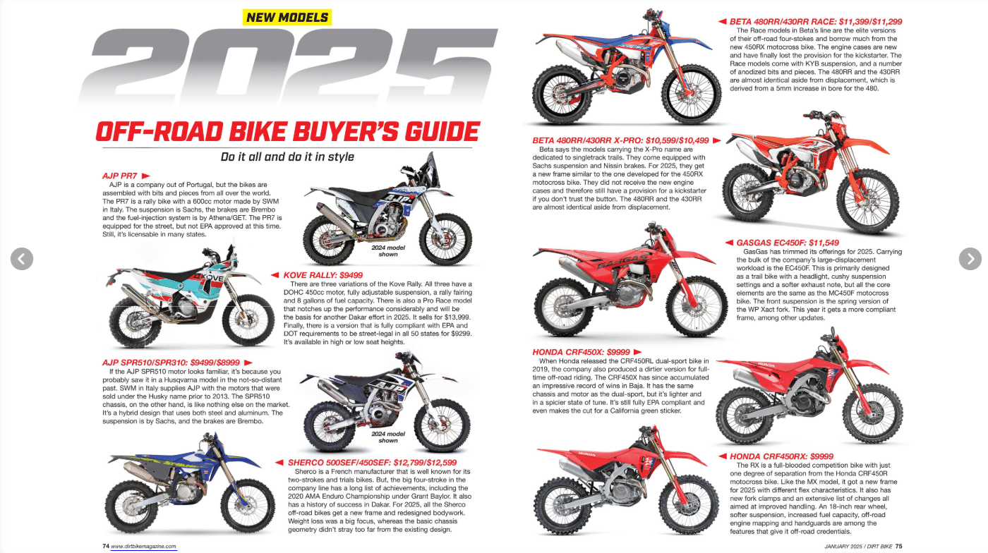 Old-timers will remember this bike from the ’90s when it was at the leading edge of four-stroke technology. It recently returned as a play bike but with fuel injection. It still has a DOHC, liquid-cooled, four-valve motor with electric start and a six-speed gearbox. The price is actually reduced for 2025. The rear suspension is adjustable. There is also a dual-sport version of this bike for $5449.