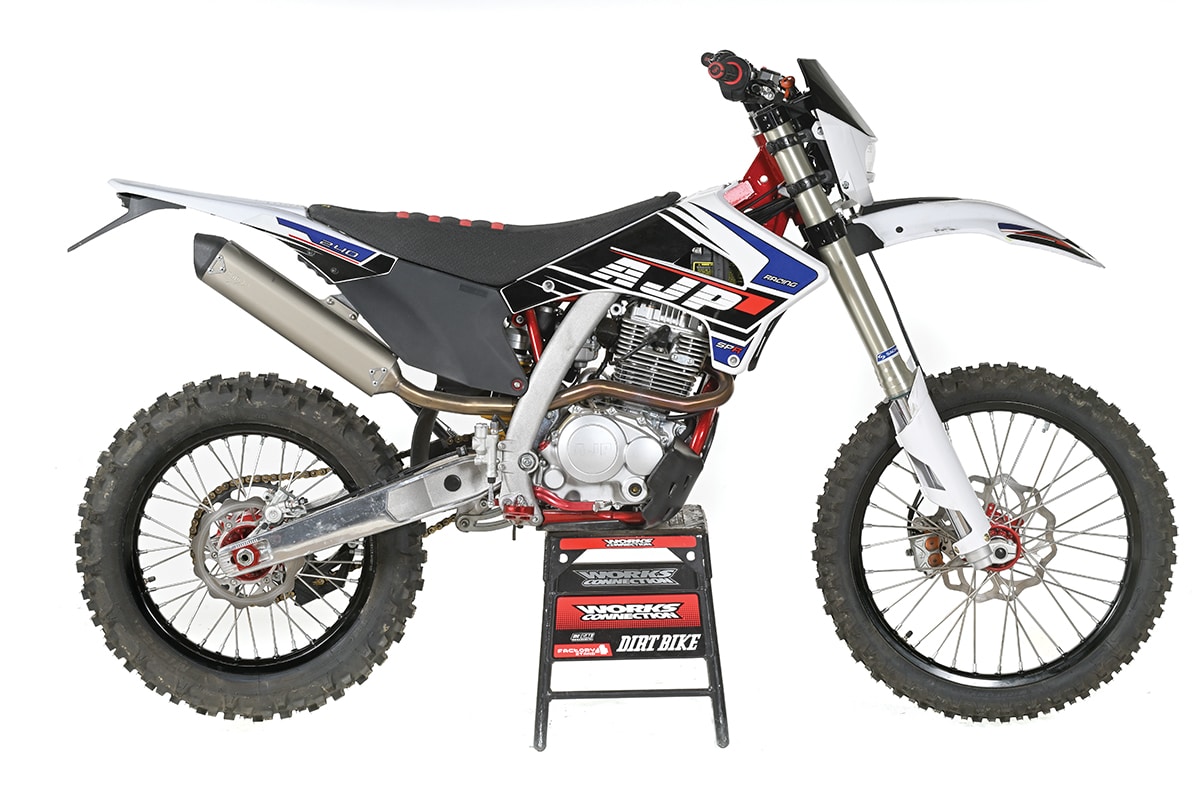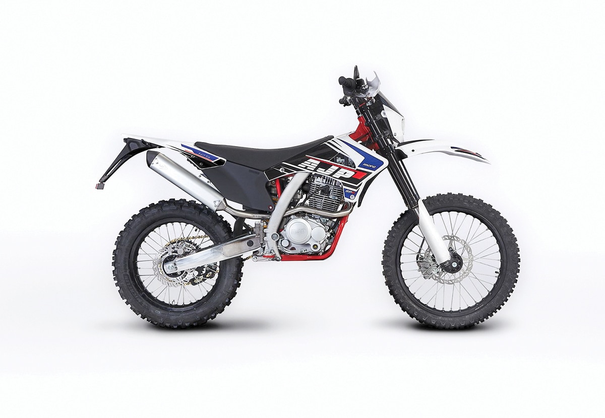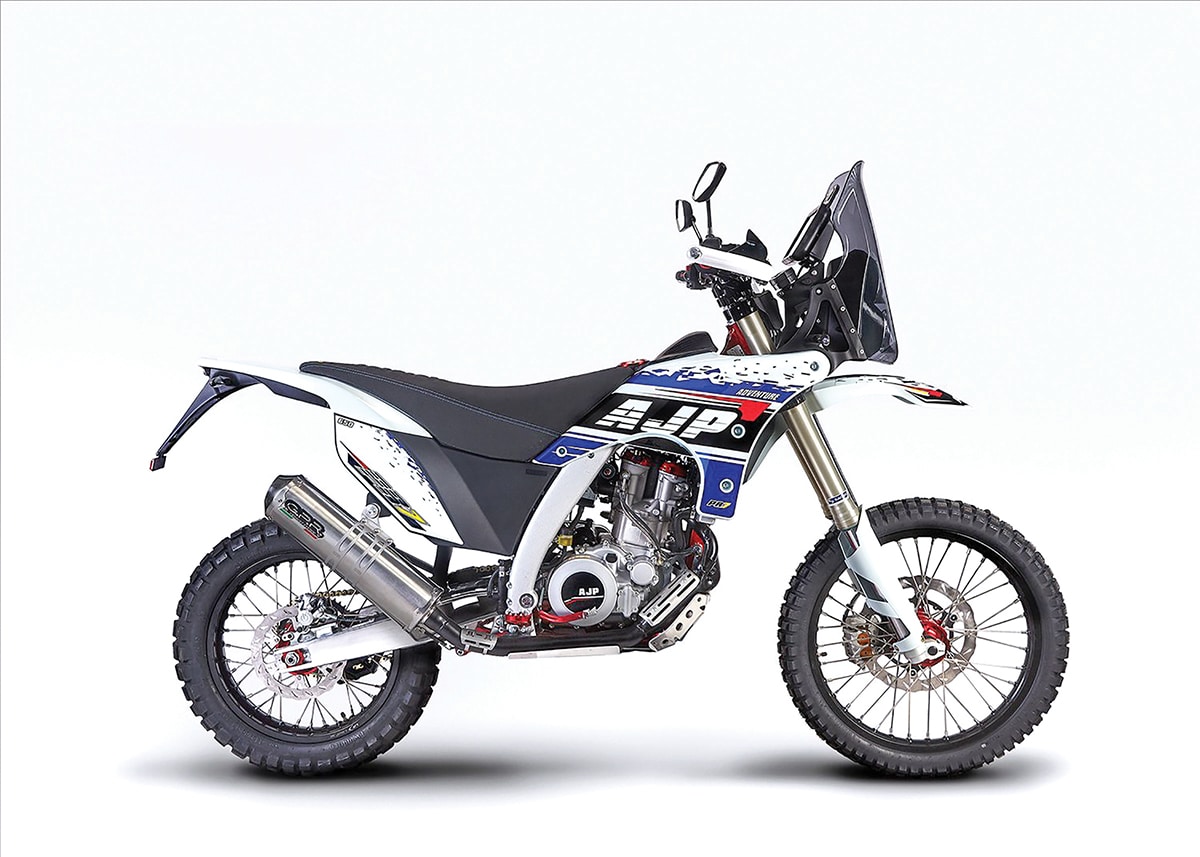 The AJP SPR250 has a European-made chassis with a Chinese motor. The frame isn’t quite like anything else on the market; it has aluminum side beams connected to a steel steering head. The suspension is by Sachs, the brakes are by Brembo and the fuel-injection system is by Athena/GET. All of the parts and accessories are high-quality aftermarket items. The overall price makes it an attractive but somewhat off-beat alternative to Japanese and European off-road bikes.