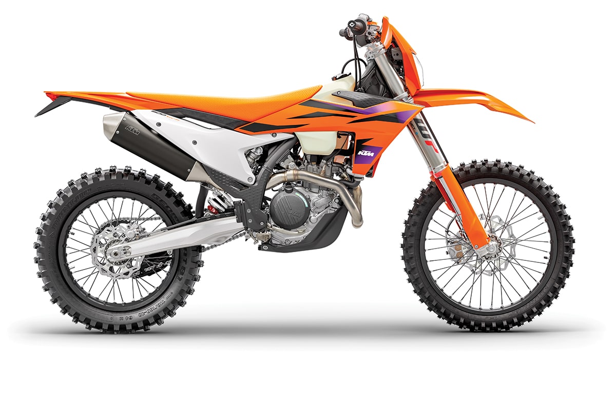 If you like the KTM 500EXC dual-sport bike but don’t need all the street-legal fluff, the XW-F is for you. It has PDS no-linkage rear suspension, a 6-speed gearbox and a very quiet exhaust note. The motor and suspension have a little more bite than the dual-sport version of the same bike. The good news for California dealers is that it complies with all that state’s regs for off-road vehicles, so you can come out of hiding.