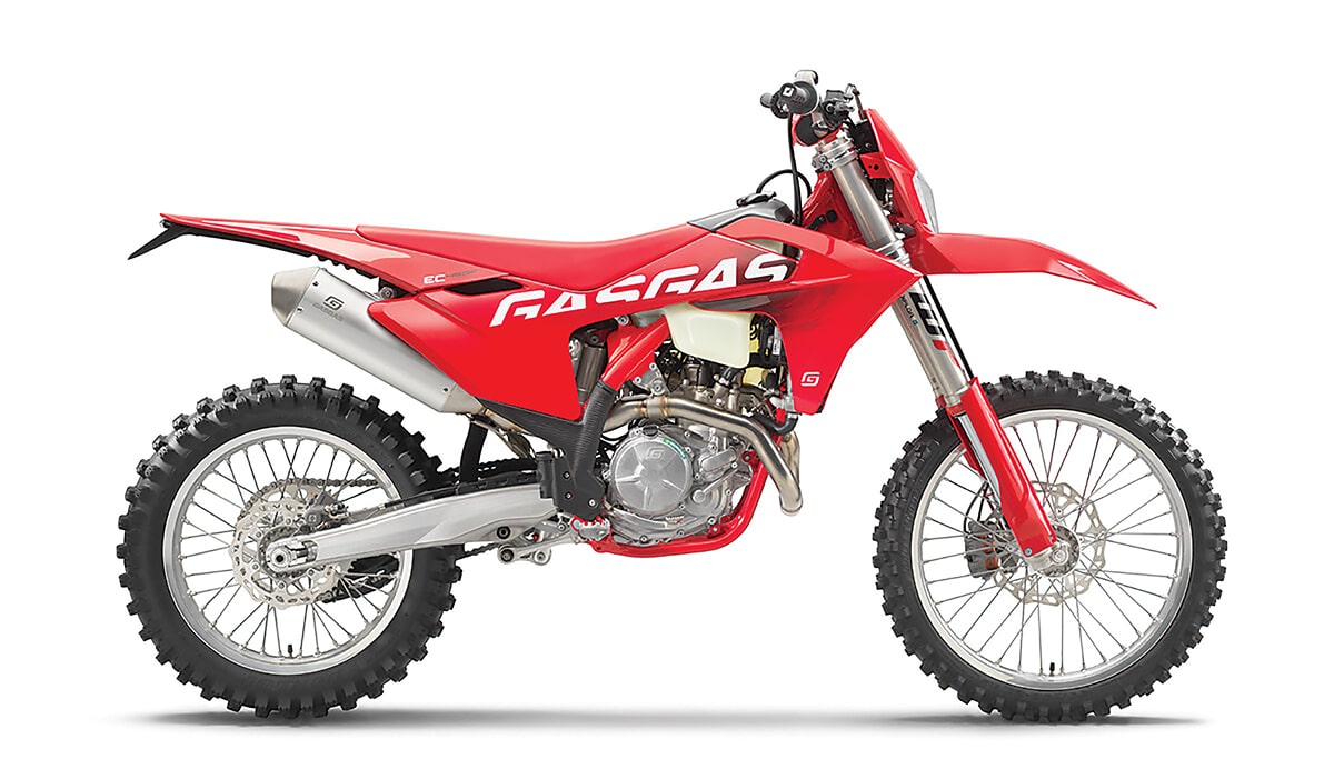 This is a full-blown race bike with performance that is essentially the same as the current GasGas MC450F motocross bike. To be legit in the off-road world, it has softer suspension with the new Xact coil-spring fork, handguards, an 18-inch rear wheel, a kickstand and more fuel capacity. It still has a 5-speed gearbox and a booming exhaust note. The brakes and hydraulic clutch are by Braktec, and the map switch is an option at the dealer level.