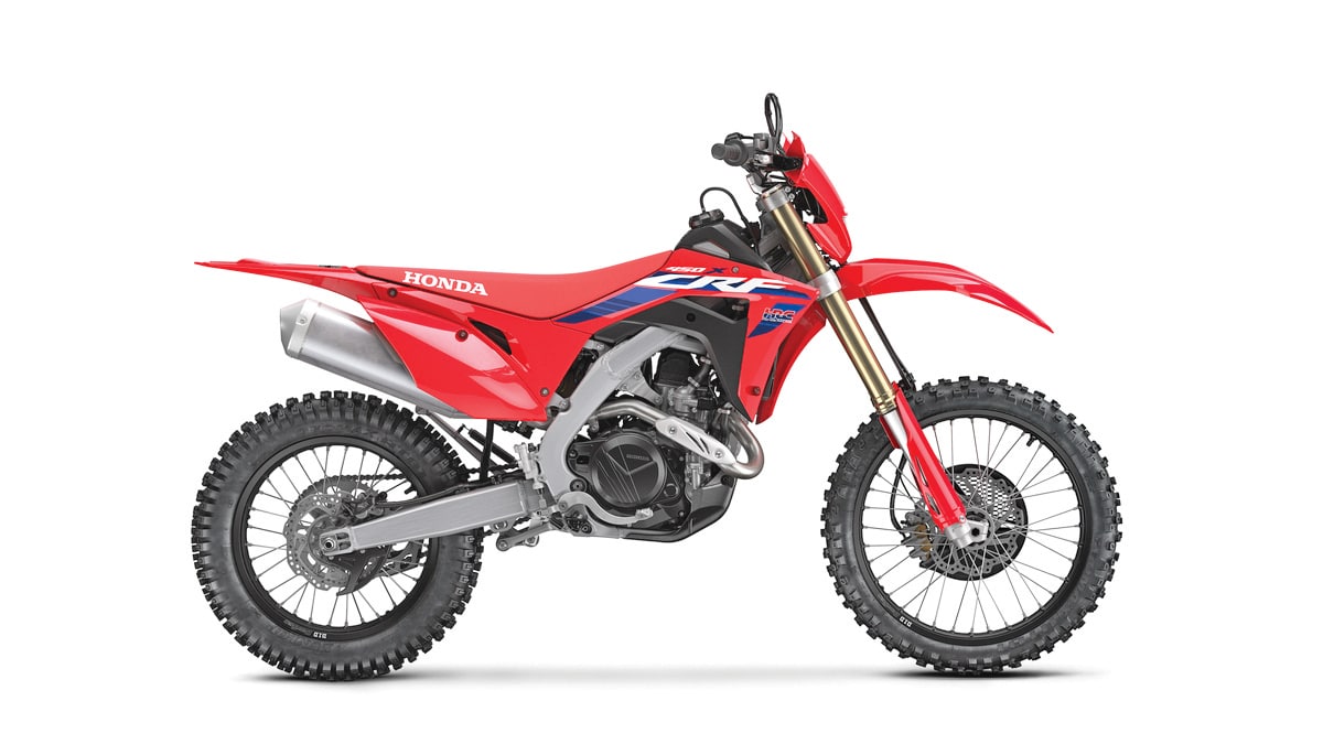 Any 250 four-stroke motocross bike starts off with a good personality for off-road use, but the Honda is particularly well suited for the job. The motor has excellent low-end power. To complete the transformation, Honda gave it off-road mapping with three power settings that are selectable through a handlebar-mounted switch. Then it got softer suspension, a larger fuel tank, handguards, a kickstand and an 18-inch rear wheel.
