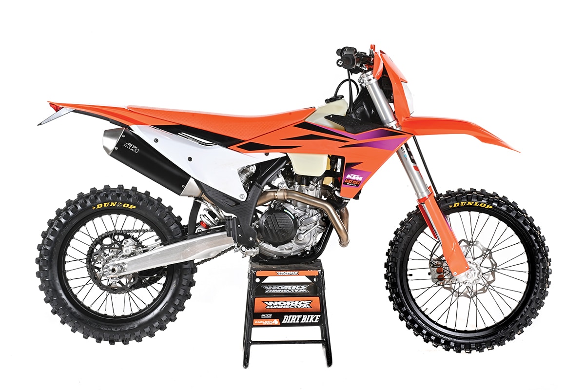 There’s a big gap between the KTM 350EXC dual-sport bike and the 350XC-F race bike. That is where this bike fits in. It uses the PDS no-linkage rear-suspension system and an Xplor coil-spring fork that’s similar to the one on the EXC. KTM has coaxed a little more performance from the 350cc 6-speed motor, mostly through less restrictive mapping. The result is a true trail bike, and the good news for California dealers and riders is that it qualifies for a state green sticker.
