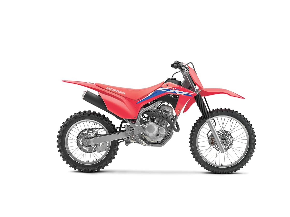 In Honda-speak, any model with an “F” for a suffix is designed to be a family-oriented model with an affordable price and an entry-level disposition. The CRF250F is just that. It has an air-cooled, fuel-injected motor with an electric starter. It also has a low seat height and front and rear disc brakes. It does not come with a headlight, taillight or any instrumentation. The CRF250F is eligible for a California green sticker.