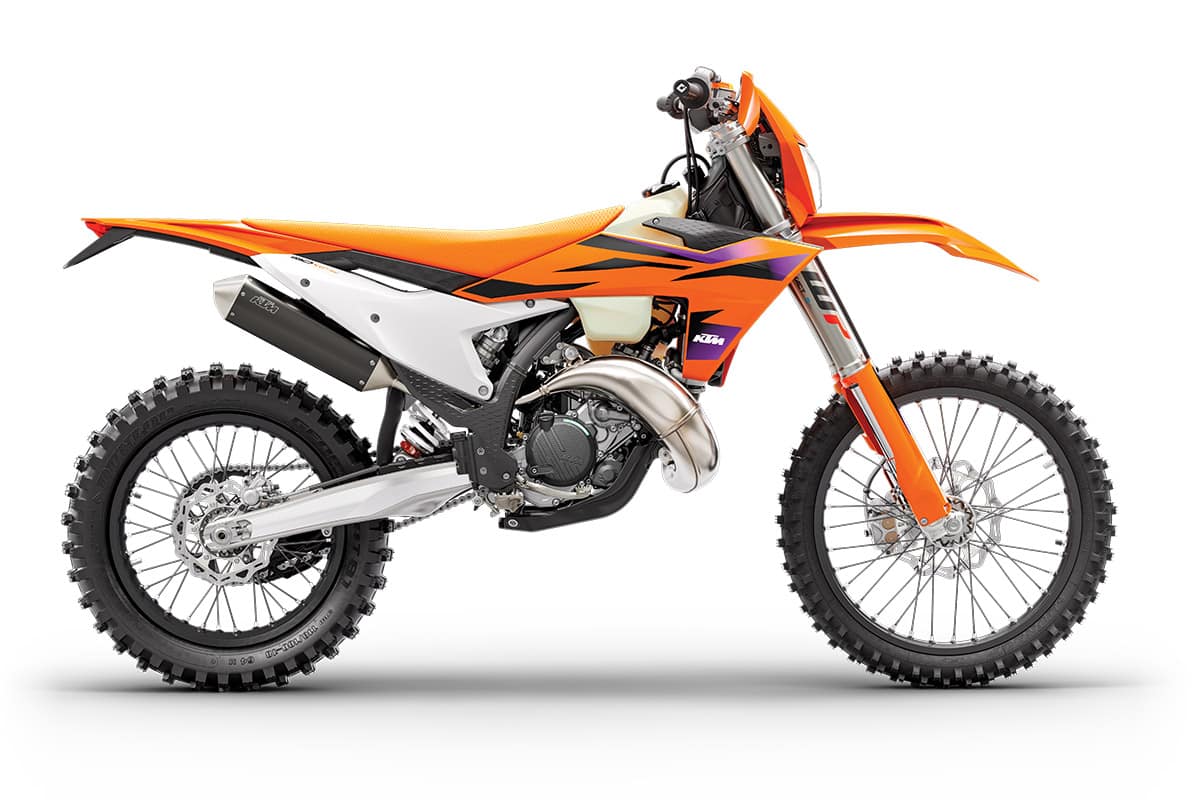 This is the second year for the reborn TX300 with throttle-body fuel injection and an electronic power valve. Everything was new on the 2023 TX300, and now it returns virtually unchanged. Husqvarna has no motocross version of this bike, but the TX has been making its way onto MX tracks all over the country because of its aggressive power delivery and suspension. It has a 6-speed gearbox, a WP Xact coil-spring fork, a Brembo hydraulic clutch and Brembo brakes. This is a pre-mix two-stroke just like old times.