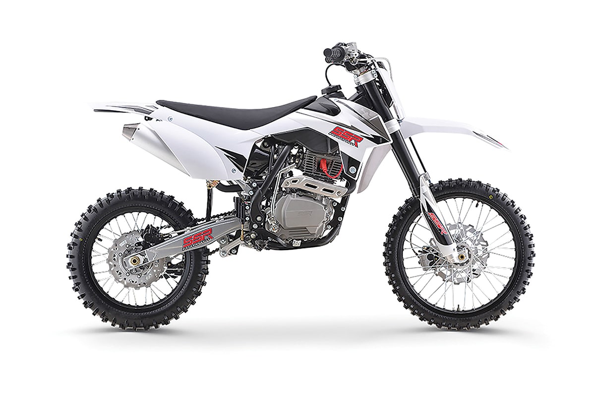 All of SSR’s off-road bikes are defined by excellent fit and finish. The SR300S is perhaps the best of the whole line when it comes to styling. The chassis and bodywork look somewhat unapologetically like a current Honda CRF450X, with welds and detailing that could virtually be from Honda. The SOHC, electric-start, liquid-cooled motor is its own beast, with a 36mm carburetor and a backup kick-starter. SSR also offers an SR250S with styling that resembles an earlier Honda for $3999.