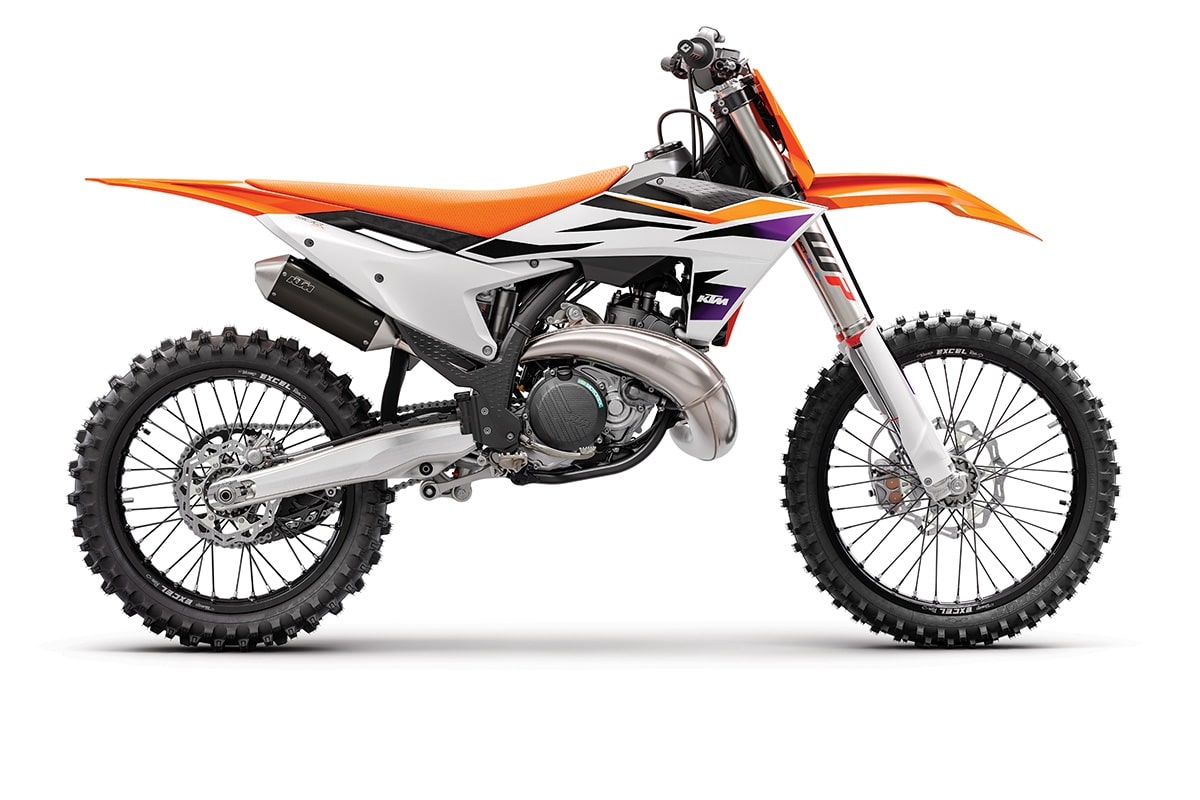 KTM gives you a choice in its motocross two-strokes. You can either go for the 250 or the 300, which are identical aside from displacement and mapping. Both are very powerful. The 300, in fact, makes more peak power than some 450 four-strokes. These bikes were redesigned in 2023 with throttle-body fuel injection and electric start. Both got a new motocross-oriented chassis with a WP Xplor air fork and linkage rear suspension. Brakes and clutch are by Brembo.