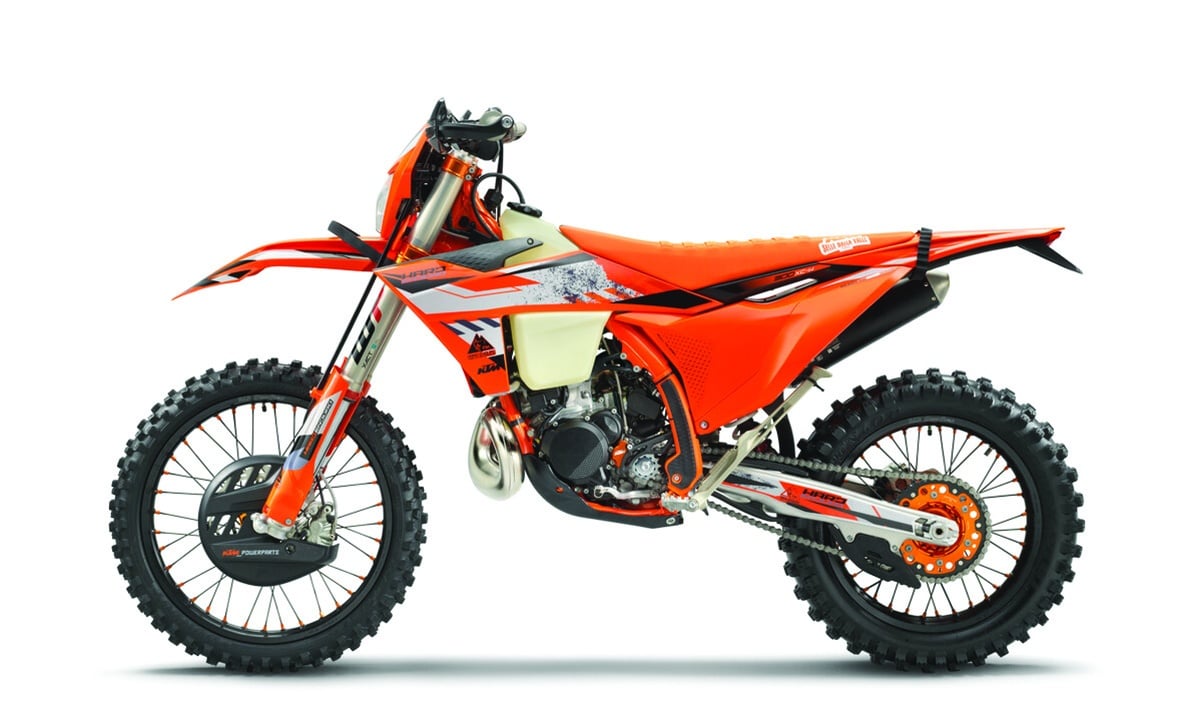 This is a Factory Edition for the off-road two-stroke guys. In previous years, it was called the ErzbergRodeo Edition, but with the global appeal of Hard Enduro events, the 2024 model is attempting to appeal to a more international market. It has a long list of upgrades, including the gripper seat cover, the CNC-machined triple clamps and lots of bling. Let’s not forget that orange frame. Under it all is the new-for-2024 300XC-W.