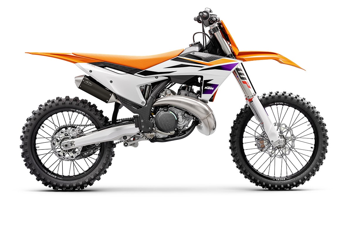 KTM gives you a choice in its motocross two-strokes. You can either go for the 250 or the 300, which are identical aside from displacement and mapping. Both are very powerful. The 300, in fact, makes more peak power than some 450 four-strokes. These bikes were redesigned in 2023 with throttle-body fuel injection and electric start. Both got a new motocross-oriented chassis with a WP Xplor air fork and linkage rear suspension. Brakes and clutch are by Brembo.