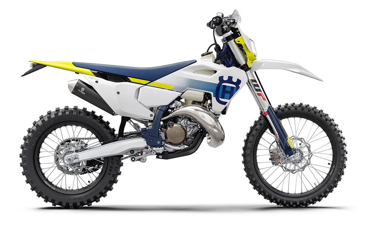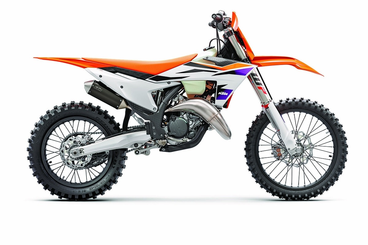 This is the second year for the reborn TX300 with throttle-body fuel injection and an electronic power valve. Everything was new on the 2023 TX300, and now it returns virtually unchanged. Husqvarna has no motocross version of this bike, but the TX has been making its way onto MX tracks all over the country because of its aggressive power delivery and suspension. It has a 6-speed gearbox, a WP Xact coil-spring fork, a Brembo hydraulic clutch and Brembo brakes. This is a pre-mix two-stroke just like old times.