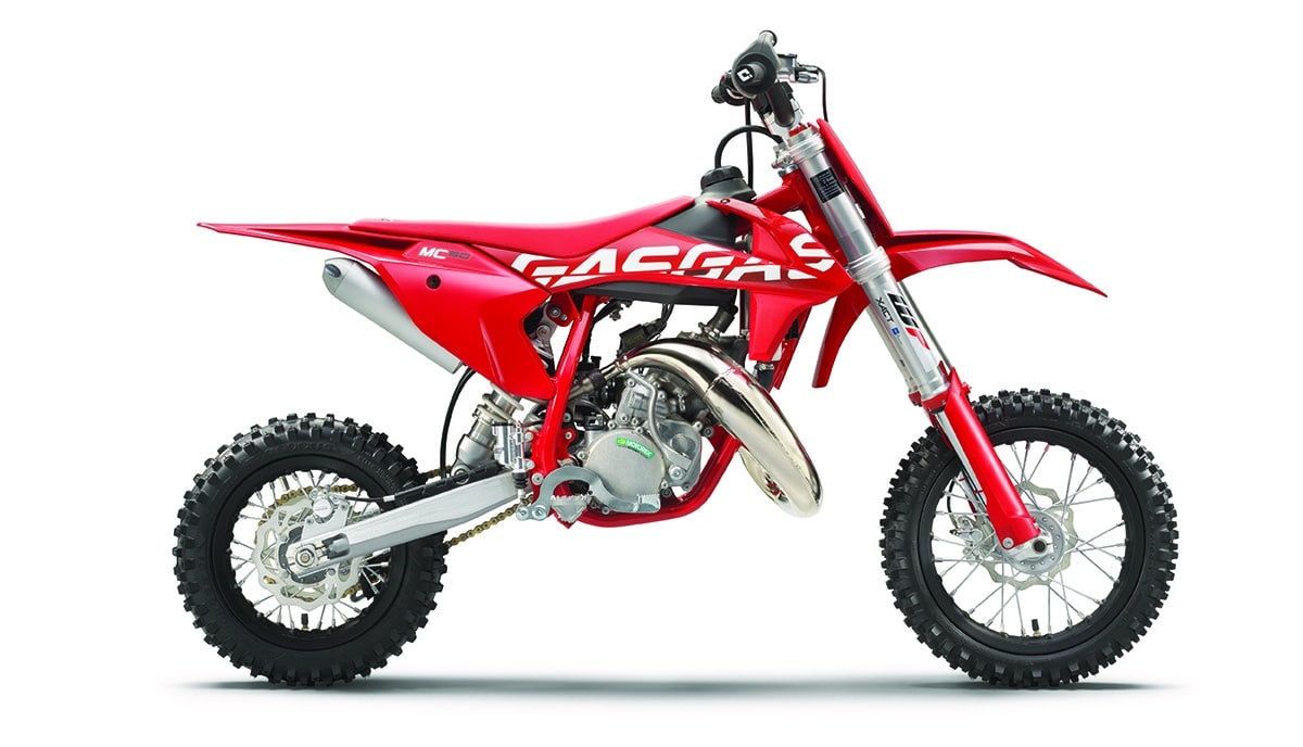 The GasGas MC50 is less expensive than its counterparts from KTM and Husqvarna, but offers all the same features. It has the same frame, suspension and motor as the TC50 and the 50SX, but with its own bodywork and look. It features an automatic transmission and a 50cc case-reed motor. The front suspension is a WP AER 35 air fork. Best of all, most 6-year-olds can actually spell “GasGas.” Very few can even say “Husqvarna.”
