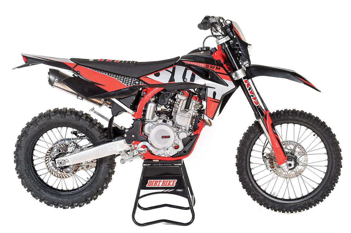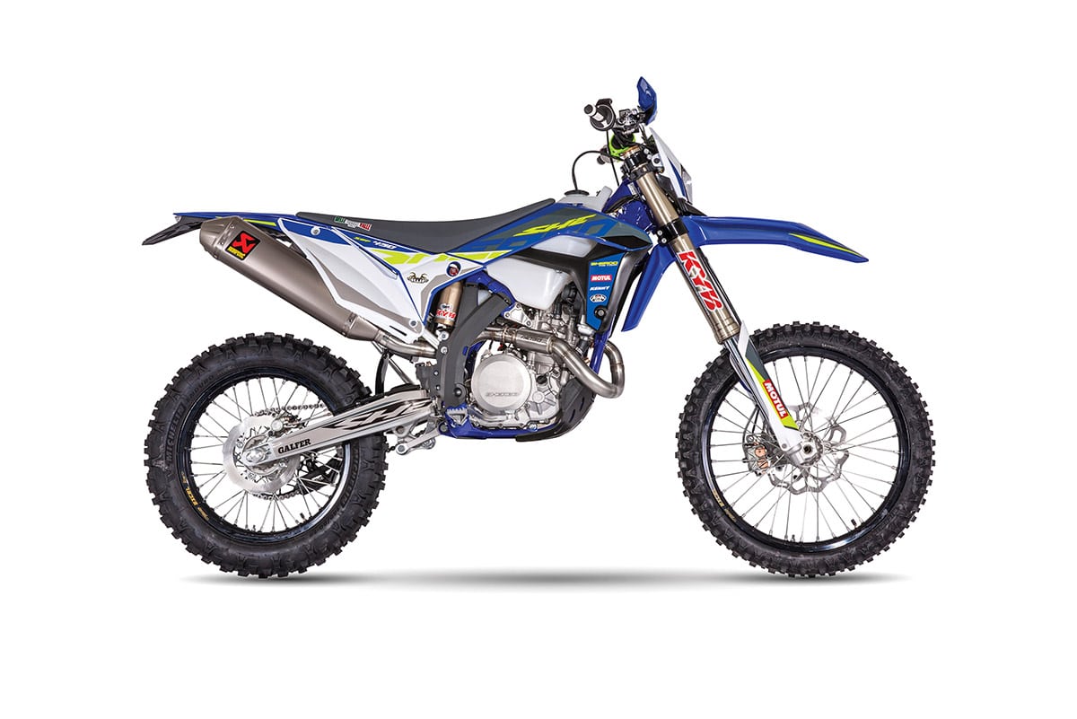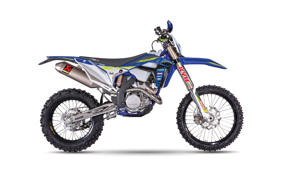 Sherco has made an impressive push in America that has upset the hierarchy in off-road racing. The two big Sherco four-strokes use the same platform that has won stages in the Dakar Rally and even finished on the podium in the GNCC XC1 class. The 450 and 500 are essentially the same bike, aside from the 3mm of bore, that push the big version to 478cc. Both have KYB suspension, Akrapovic silencers and 6-speed gearboxes.