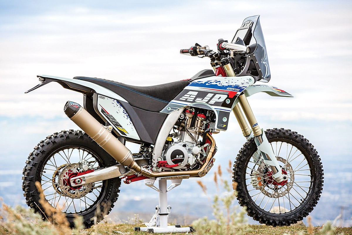 Schlagel Marine in the American Northwest is the importer for AJP, which is a company based in Portugal. The PR7 is the top of the line, with a 600cc motor that was originally developed by Husqvarna and is now manufactured in Italy by SWM. The chassis has a perimeter frame, and a rally tower comes as standard equipment. There are also 510cc and 310cc versions, as well as entry-level AJP models in 240 and 250 sizes.