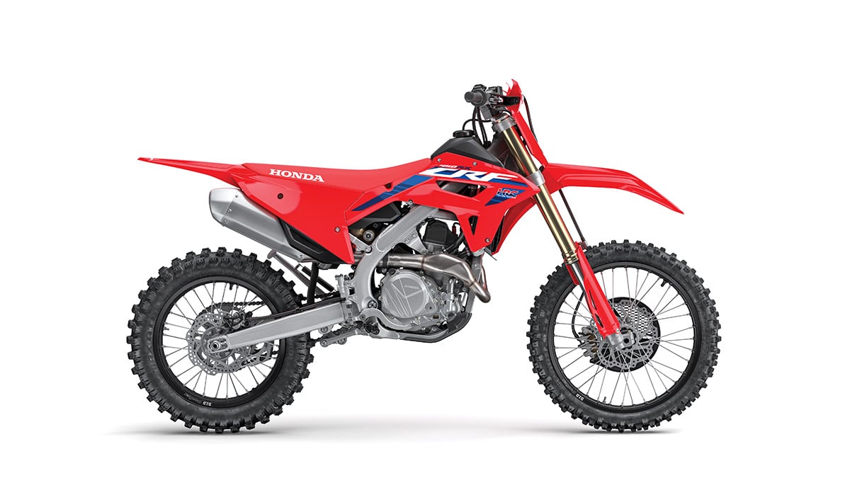The CRF450RX got the same changes as the motocross version for 2023. They include a narrower intake-port shape and longer intake funnel, a revised cam profile, and a smaller throttle-body diameter. The frame’s rigidity has been altered by increasing material thickness in strategic locations and through the use of steel engine mounts. For its off-road mission, the RX has a 2.1-gallon fuel tank, softer suspension, an 18-inch rear wheel, a kickstand and handguards.