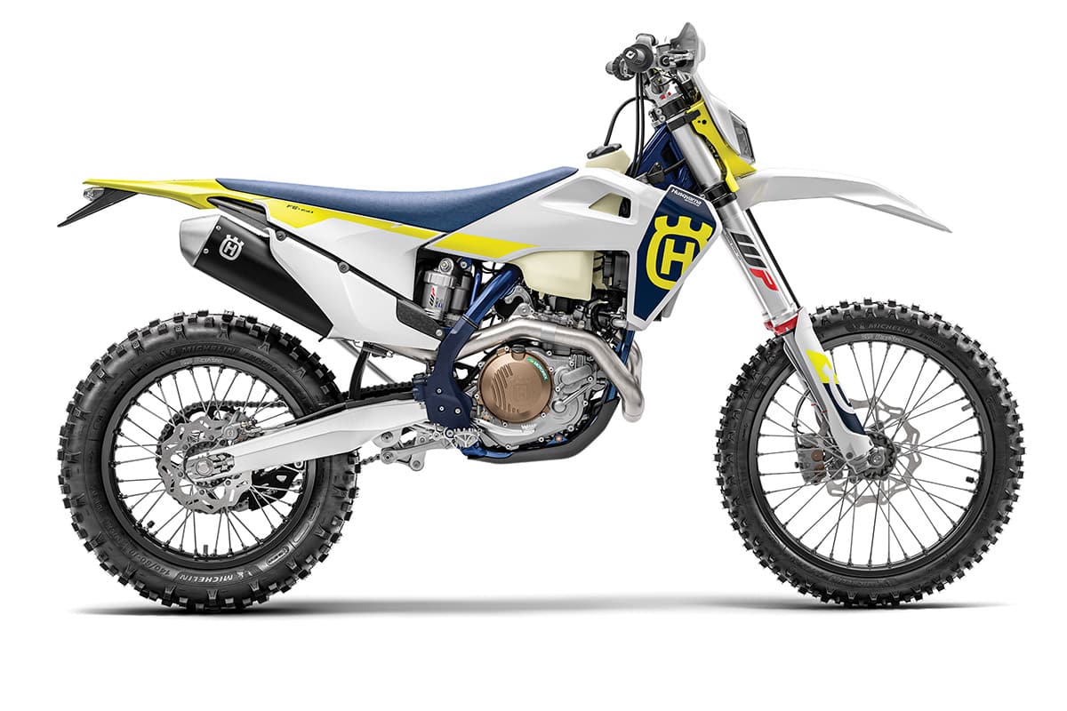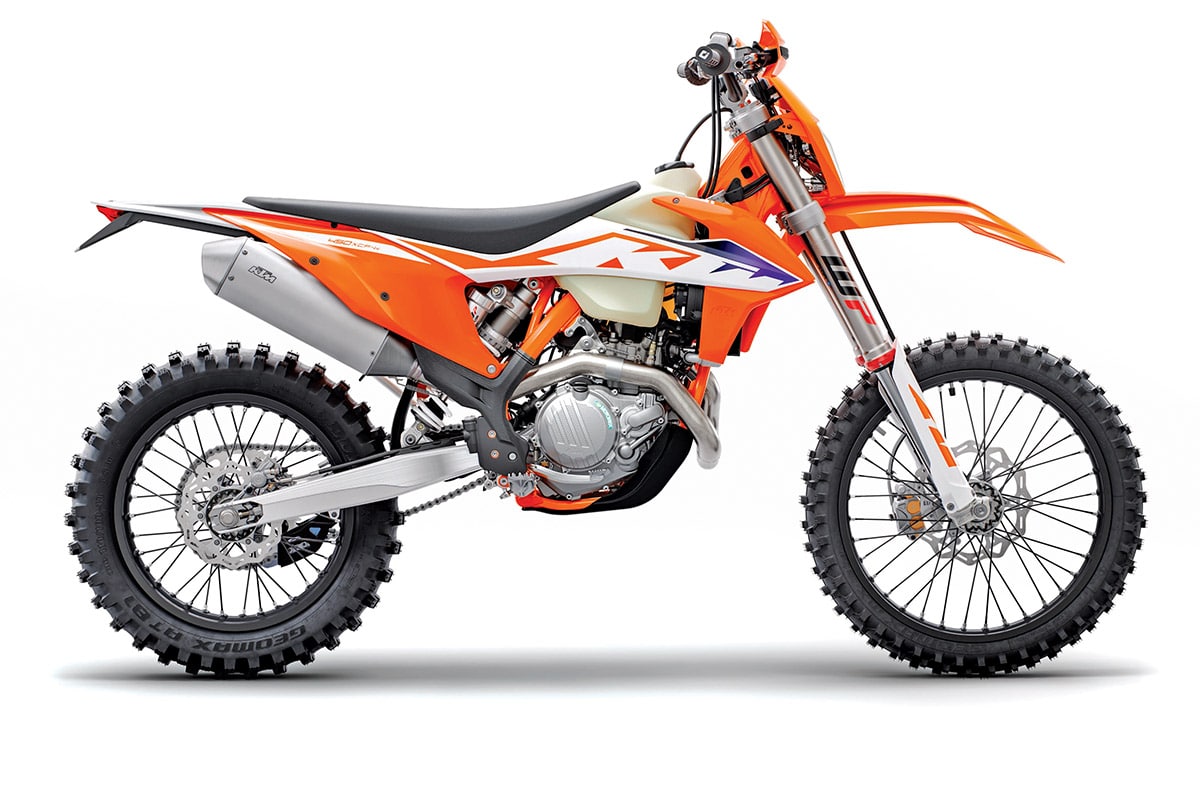 This is the winningest off-road race bike in America. Most of Kailub Russell’s record-breaking 67 GNCC wins came aboard the 350, which is known for being both smooth and fast. The 2023 version is all new, with a stiffer frame, new bodywork and redesigned rear suspension. The gearbox is still a 6-speed but now has a slightly broader spread. In terms of power, the 350XC-F is identical to the 350SX-F motocross bike. It has softer suspension and off-road accouterments.