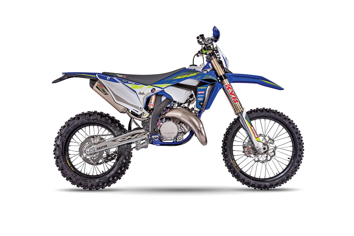 Sherco’s 125 two-stroke is still the newest bike in the line, introduced in 2018. As such, it has received evolutionary changes each year. The SE125 Factory has electric start, as well as an electronic power valve. The fork is a closed-cartridge KYB, and the brakes are Brembos. The SE125 also has lights and an odometer. A Keihin carburetor feeds a Moto Tassinari V-Force reed block.