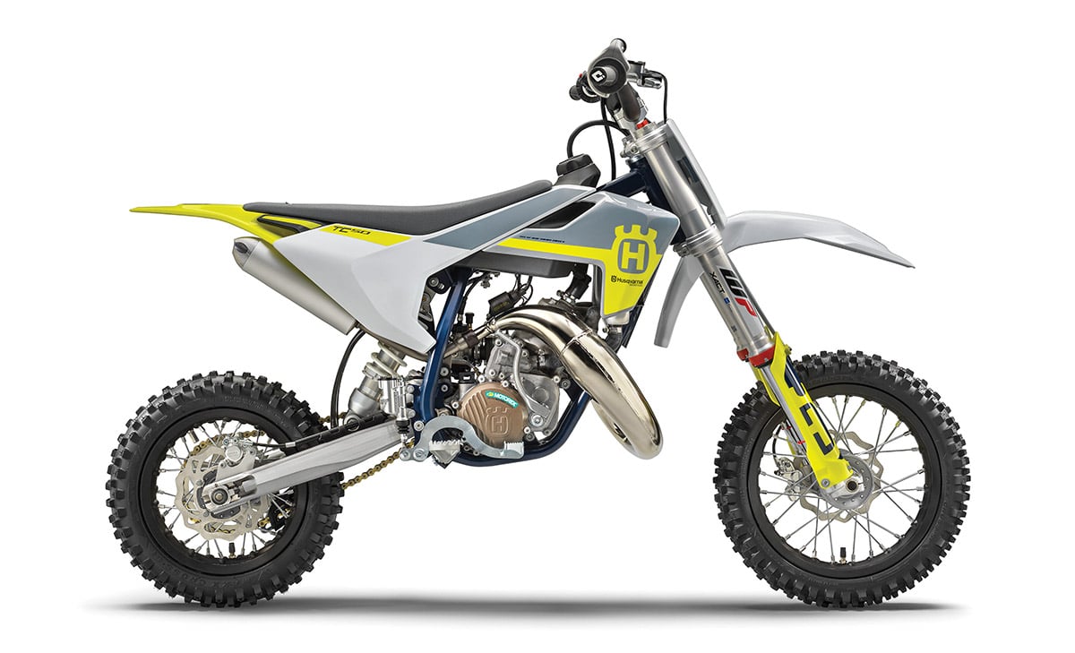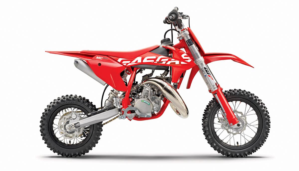 In keeping with the overall philosophy for the brands under the Pierer Mobility roof, the GasGas MC50 is less expensive than its siblings from KTM and Husqvarna. It offers the same frame, suspension and motor as the TC50 and the 50SX but has its own bodywork. It features an automatic transmission and 50cc, case-reed motor. The front suspension is a WP AER 35 air fork. Plus, it’s red. What kid doesn’t like that?