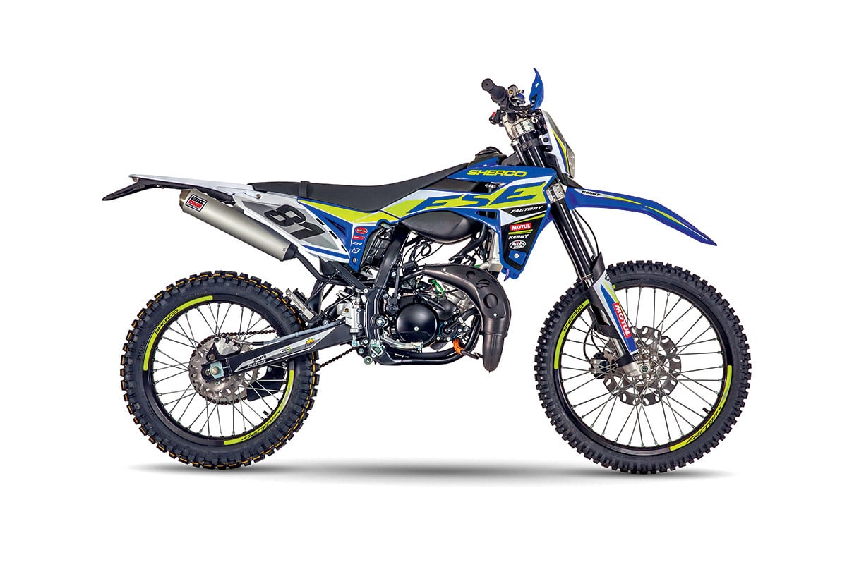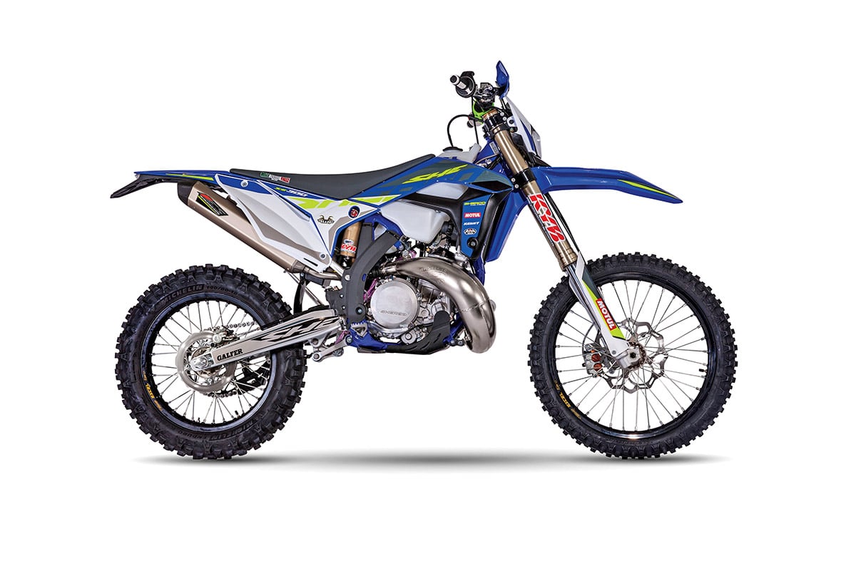 Sherco has become a premier name in the world of hard enduro, with riders like Cody Webb, Mario Roman and Wade Young taking them to the top of some of the most difficult races in the world. The SE300 and SE250 are electric-start, carbureted two-strokes with electronic power valves, hydraulic clutches, Brembo brakes and a reputation for excelling in the worst terrain. The 2023 models have closed-cartridge KYB suspension.
